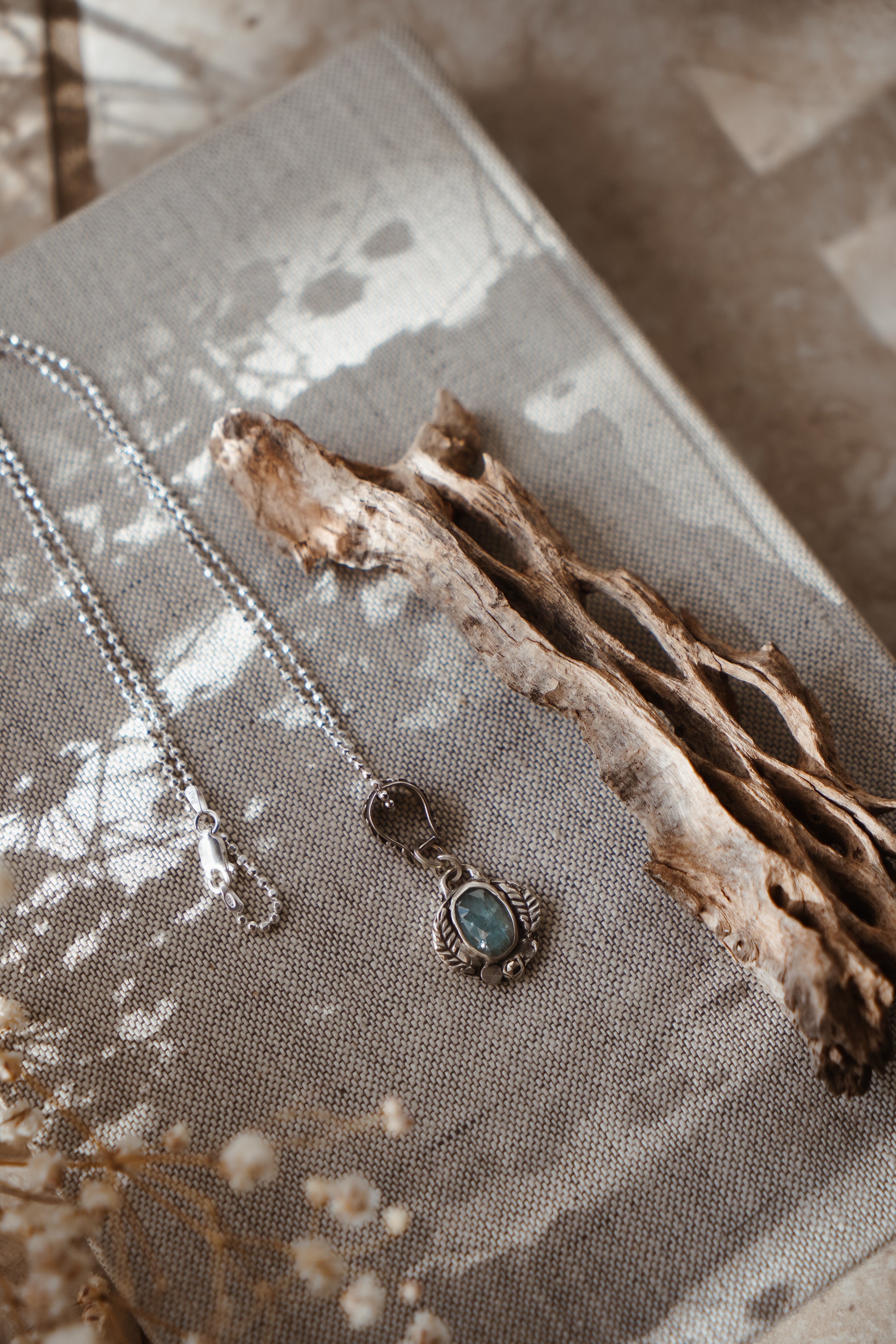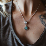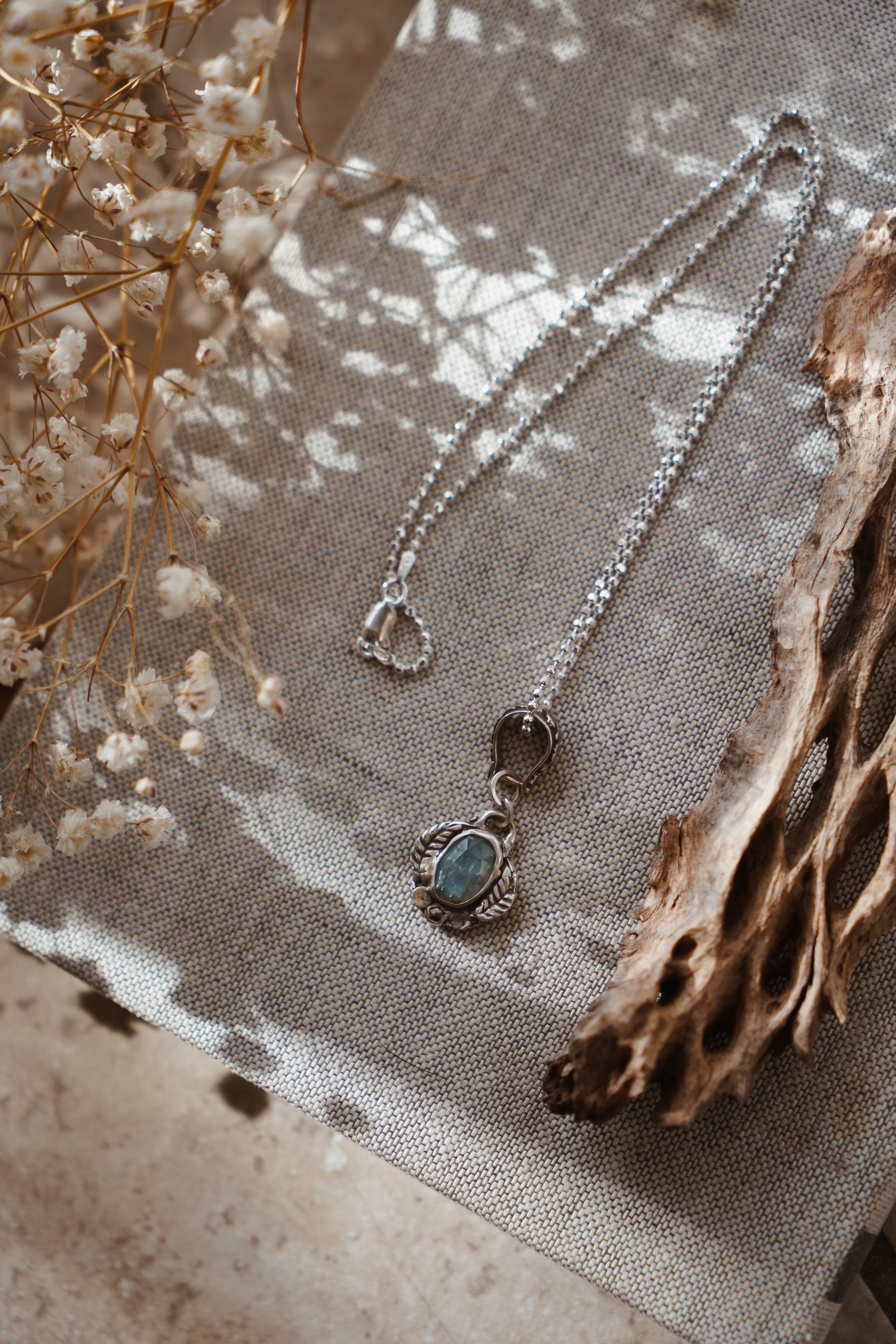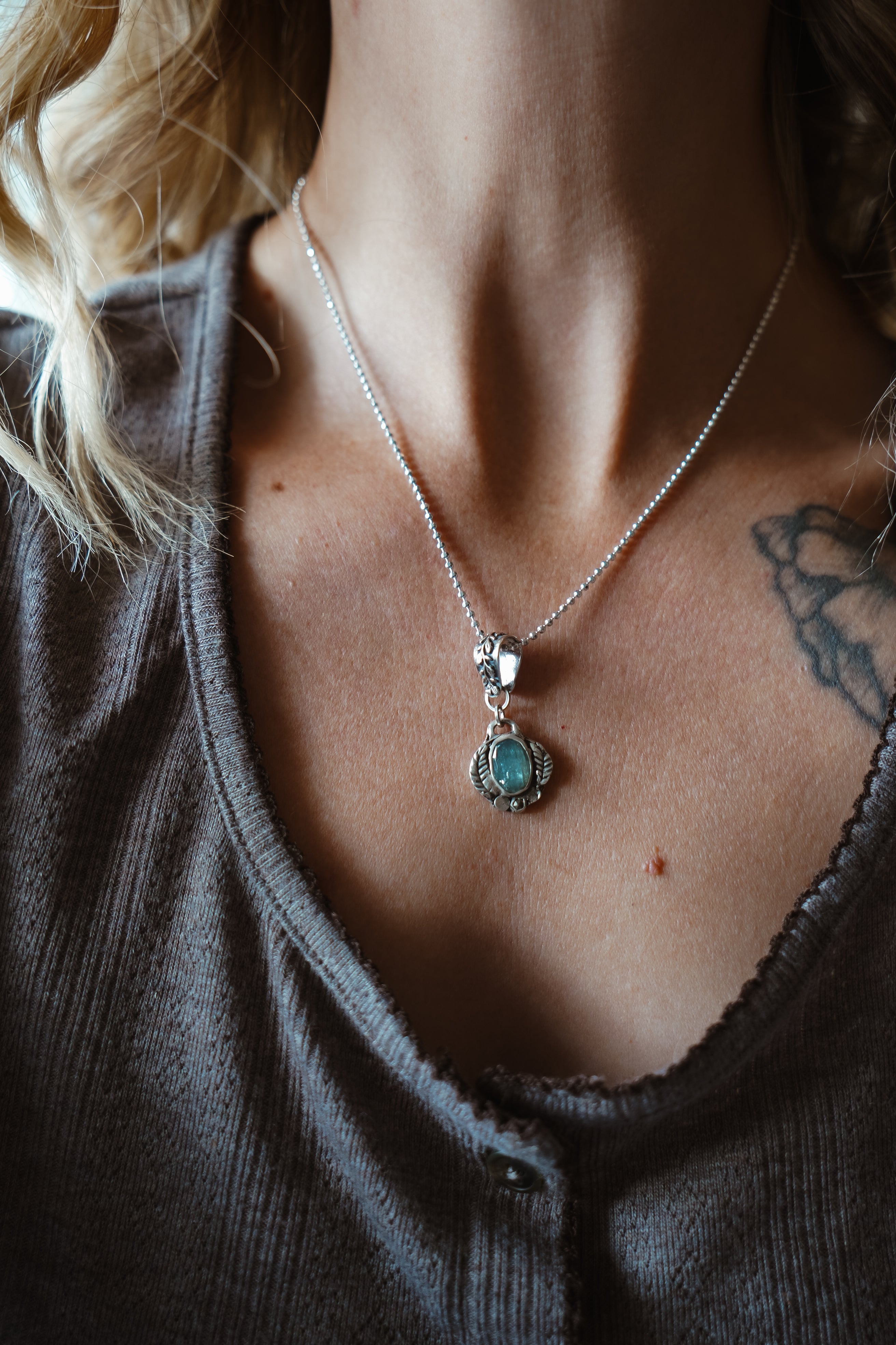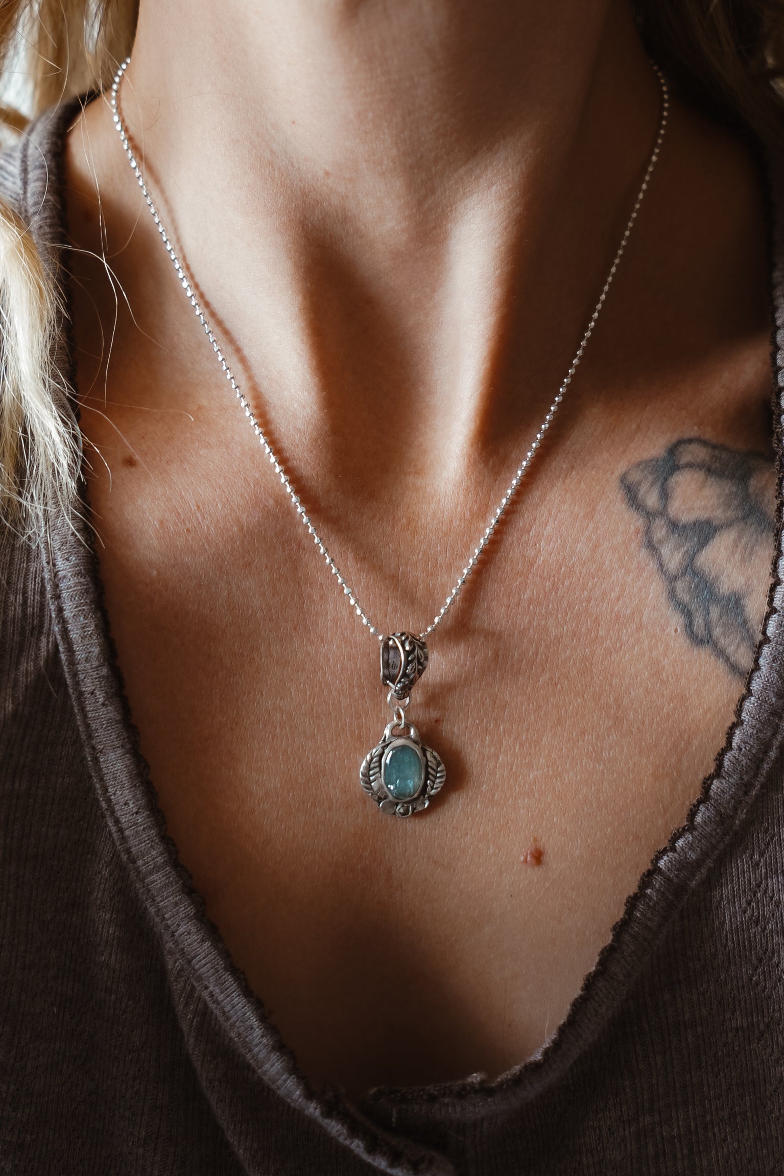We've had so much fun creating with a new process using .999 fine silver metal clay that we fire in our small kiln. We sculpted and carved this piece by hand from metal clay, fired it up, and this gorgeous pendant was the result. These stones, decorative bail, and bead chain all make magic in natural light.