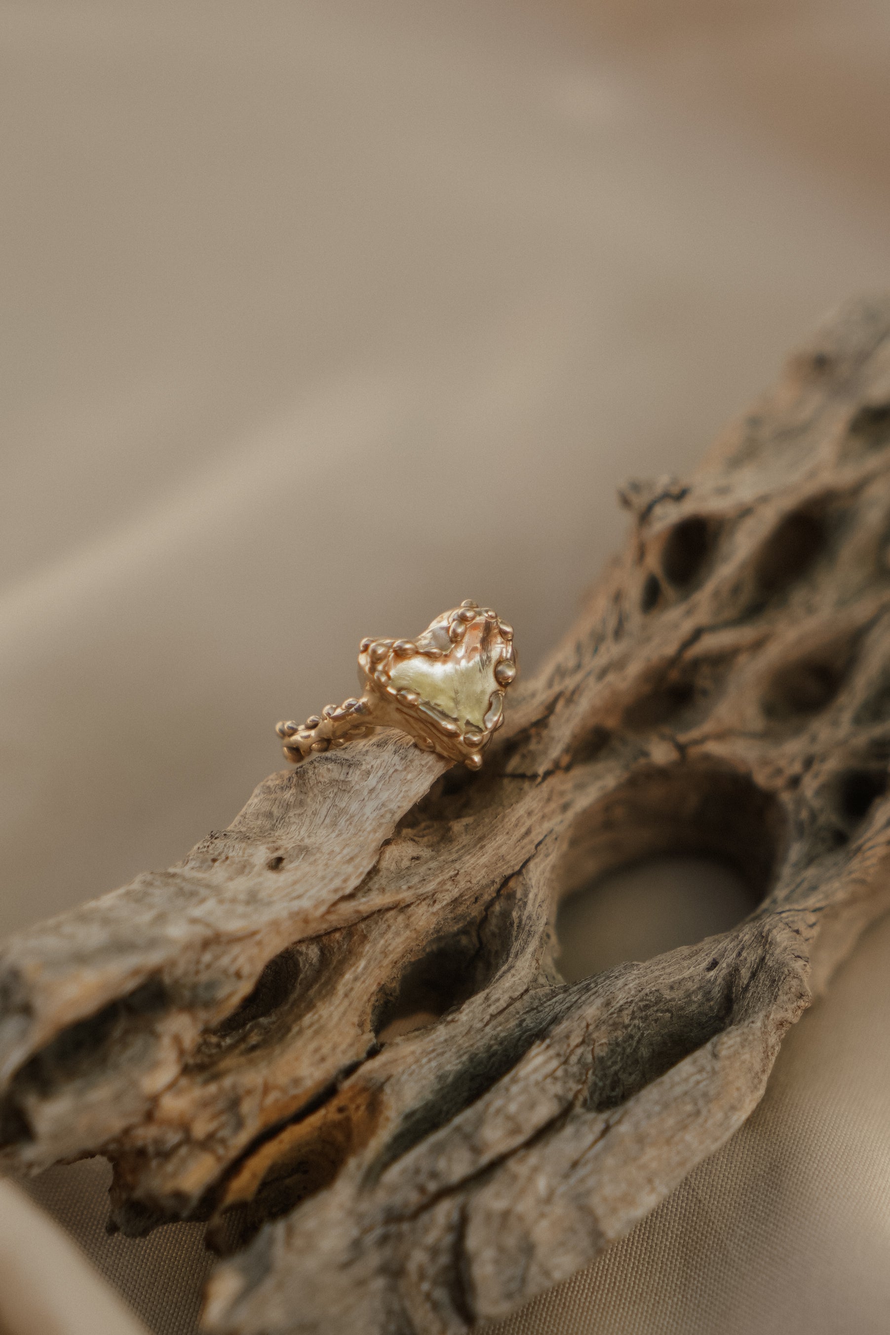 The Rooted Love Ring features a delicate heart design inspired by natural forms and textured details. Its intricate craftsmanship evokes the organic beauty of intertwined roots, symbolizing enduring connection and growth.