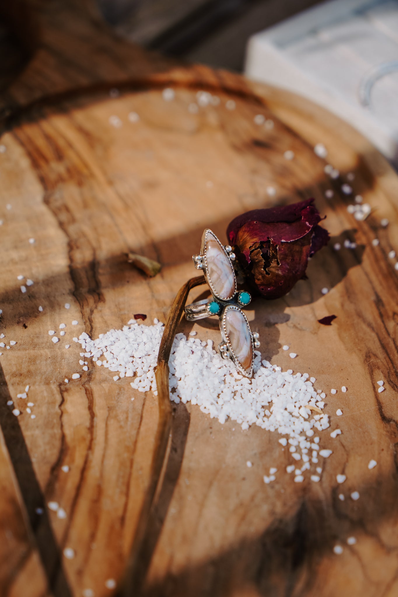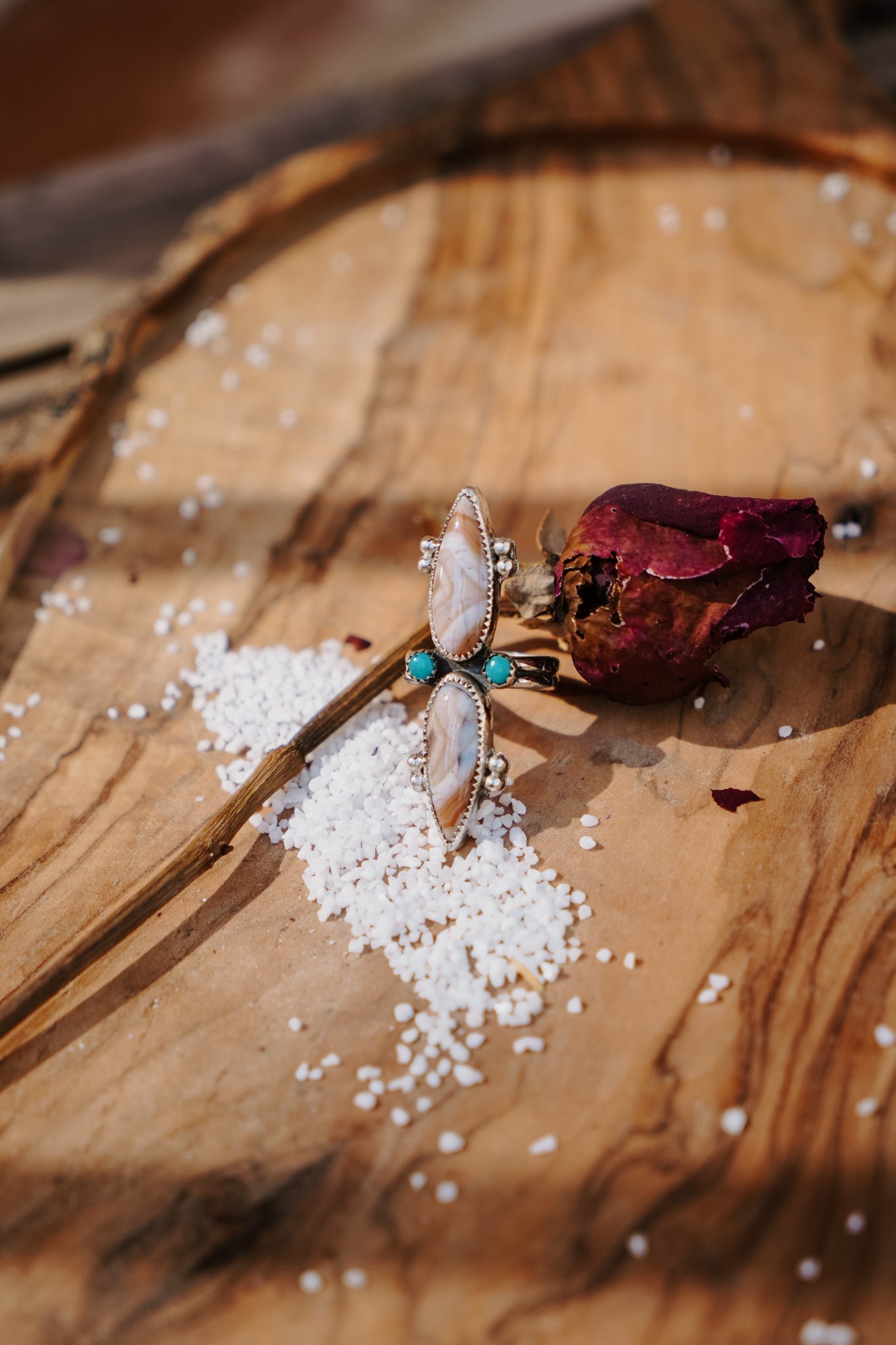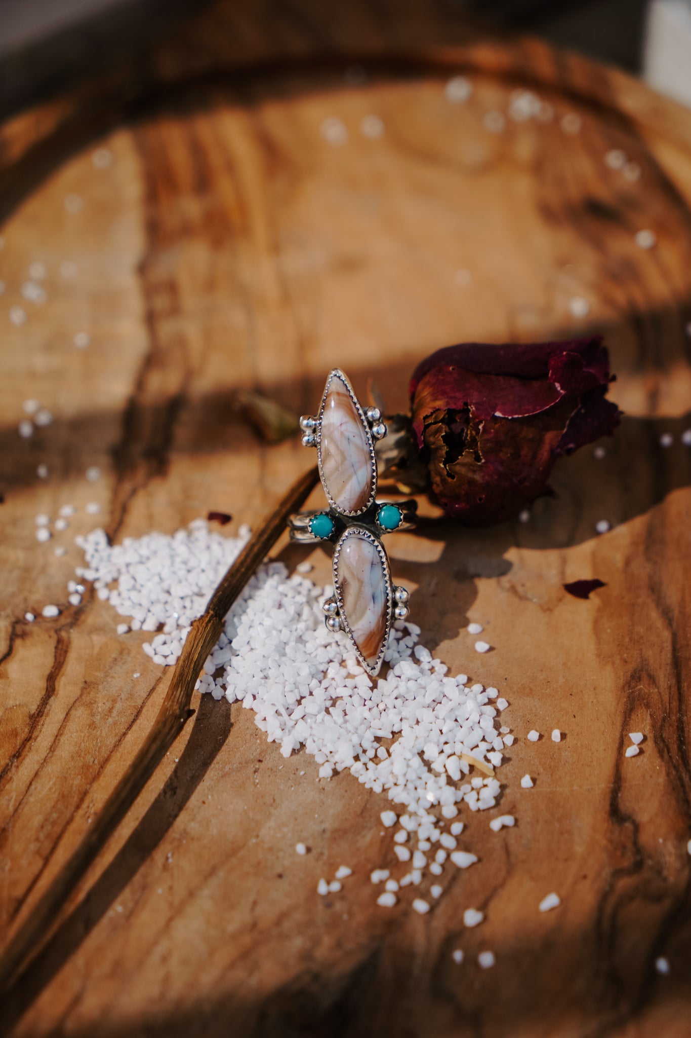 This is such a fun ring design- we love the way the small turquoise accent stones mix with the creamy agate. And it's all finished off with some symmetrical ball elements and a split, hand-stamped ring band.