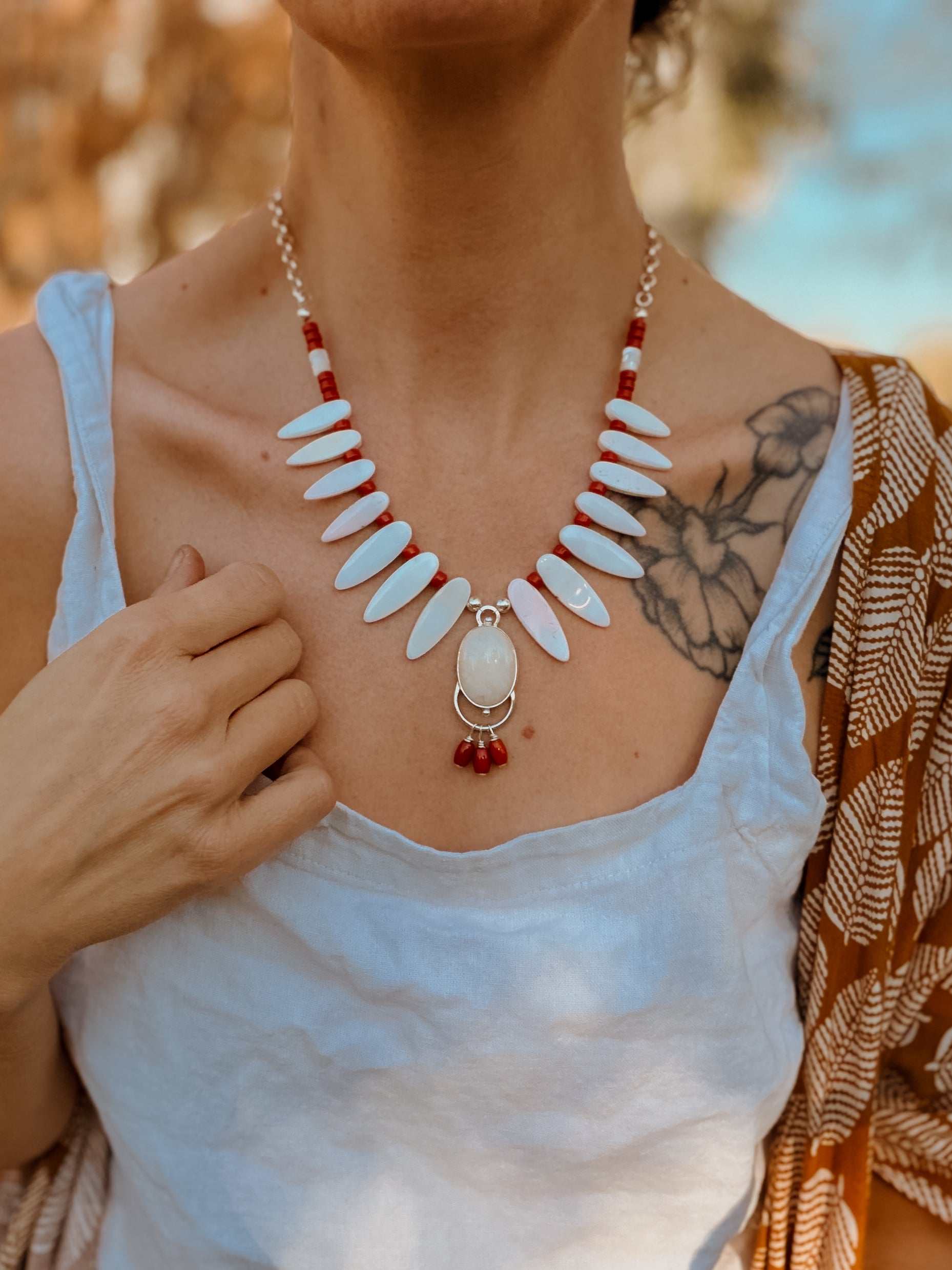 The Solace Necklace in Mother of Pearl, Coral, & Morganite