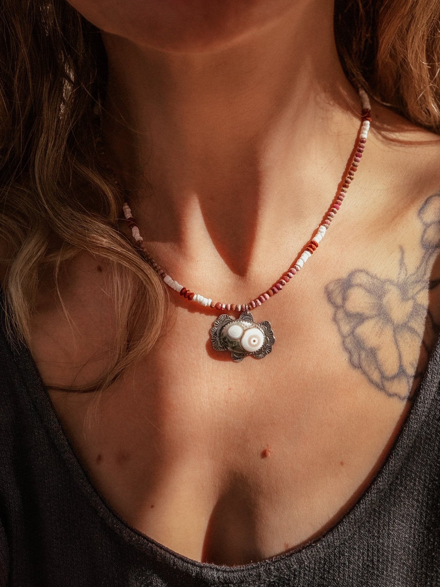 This Ocean Jasper is so special- we love the swirly patterns. Add in the funky, hand-stamped back plate and colorful bead chain and you've got a really special piece. We can't wait to see who ends up with this beauty!