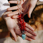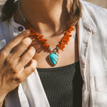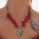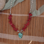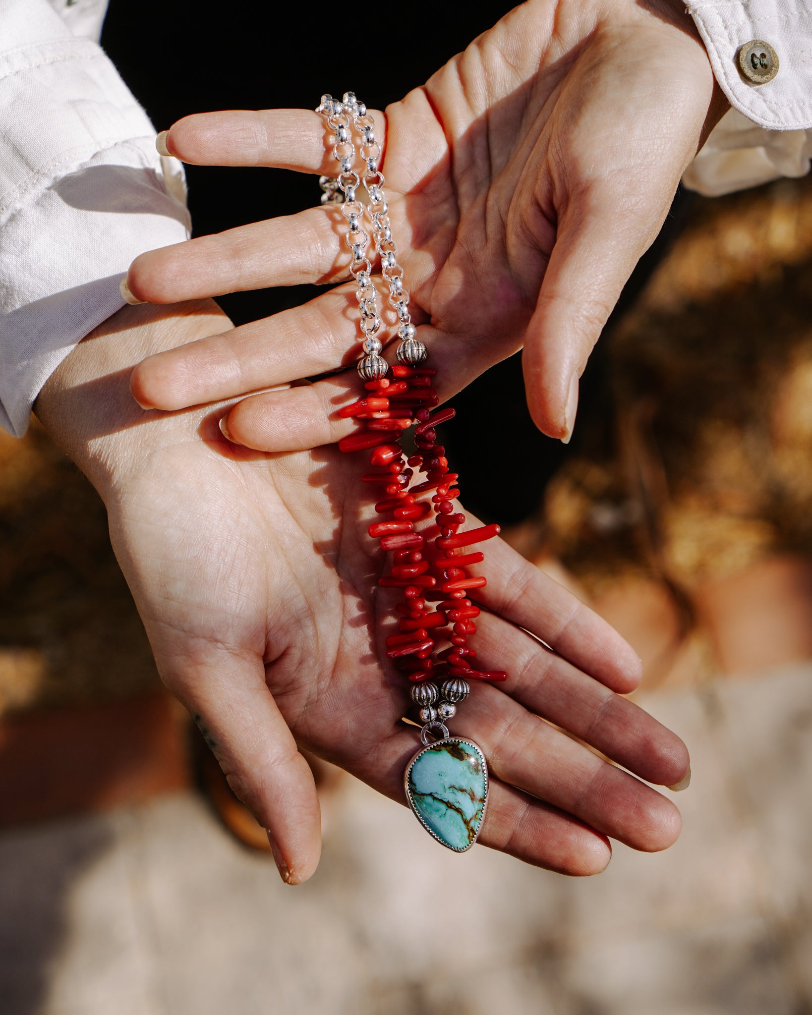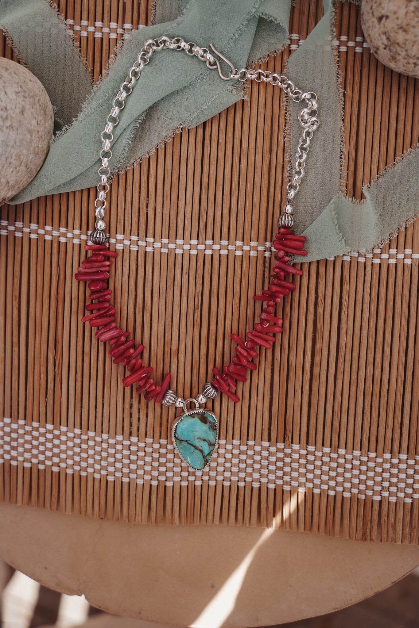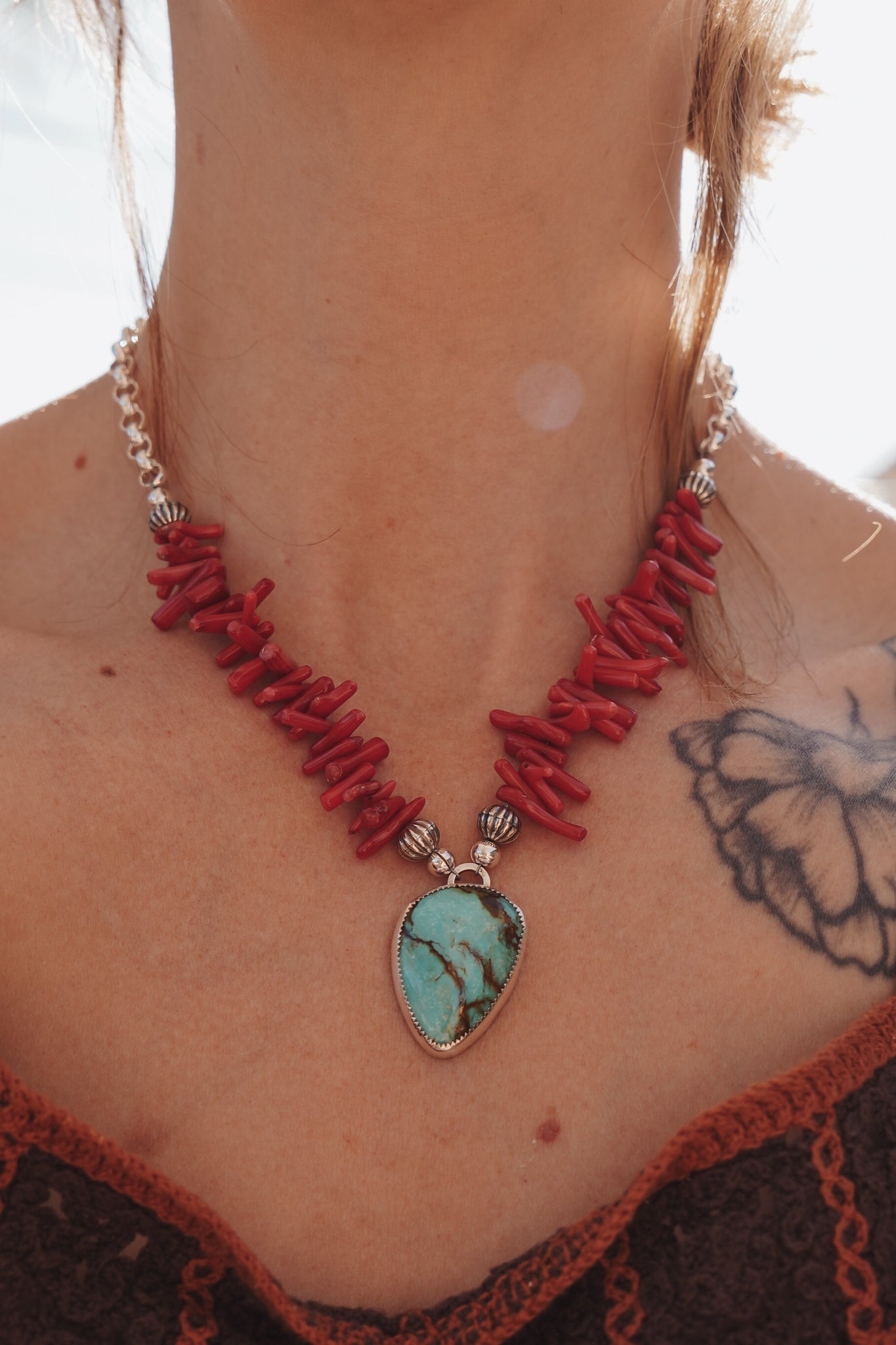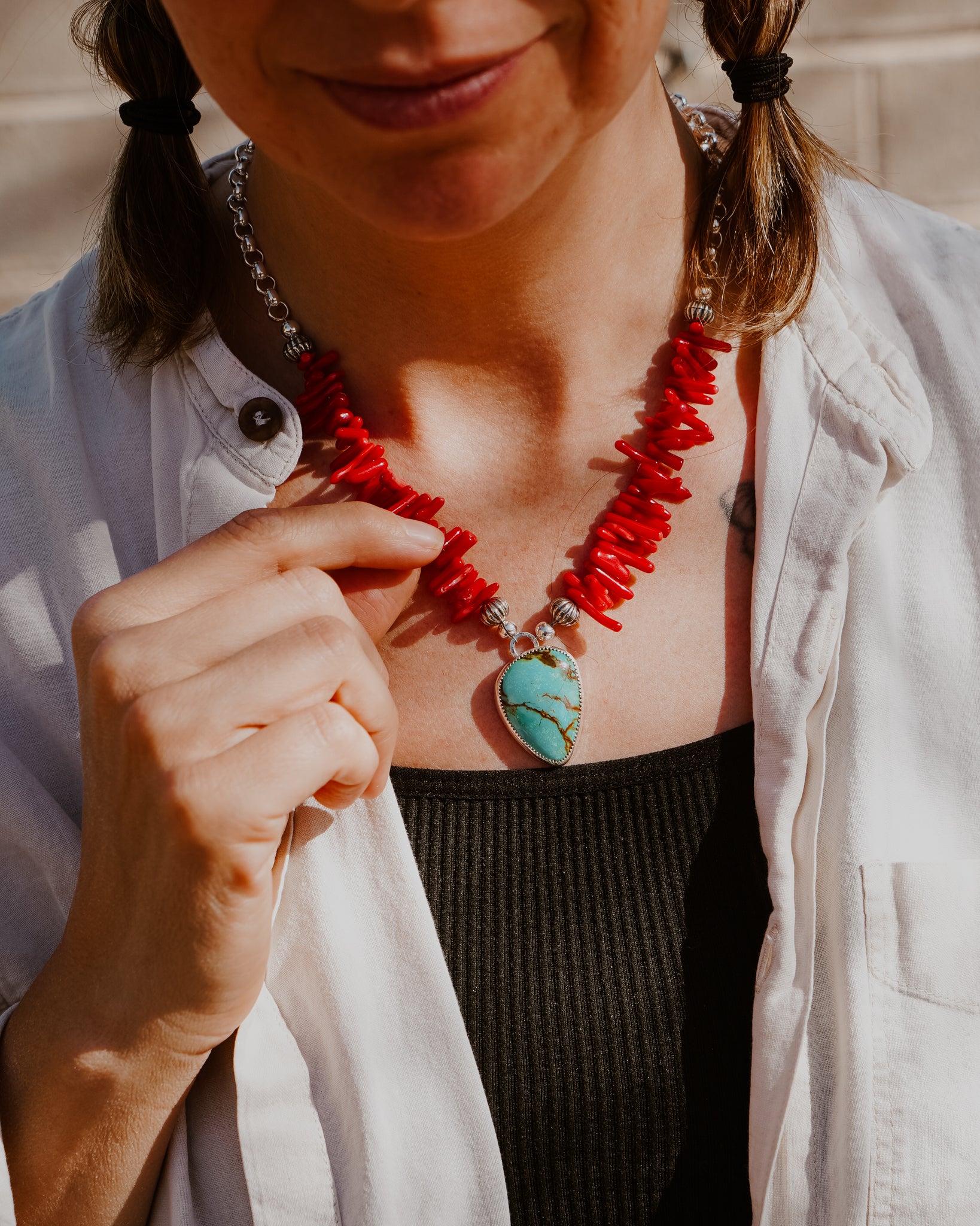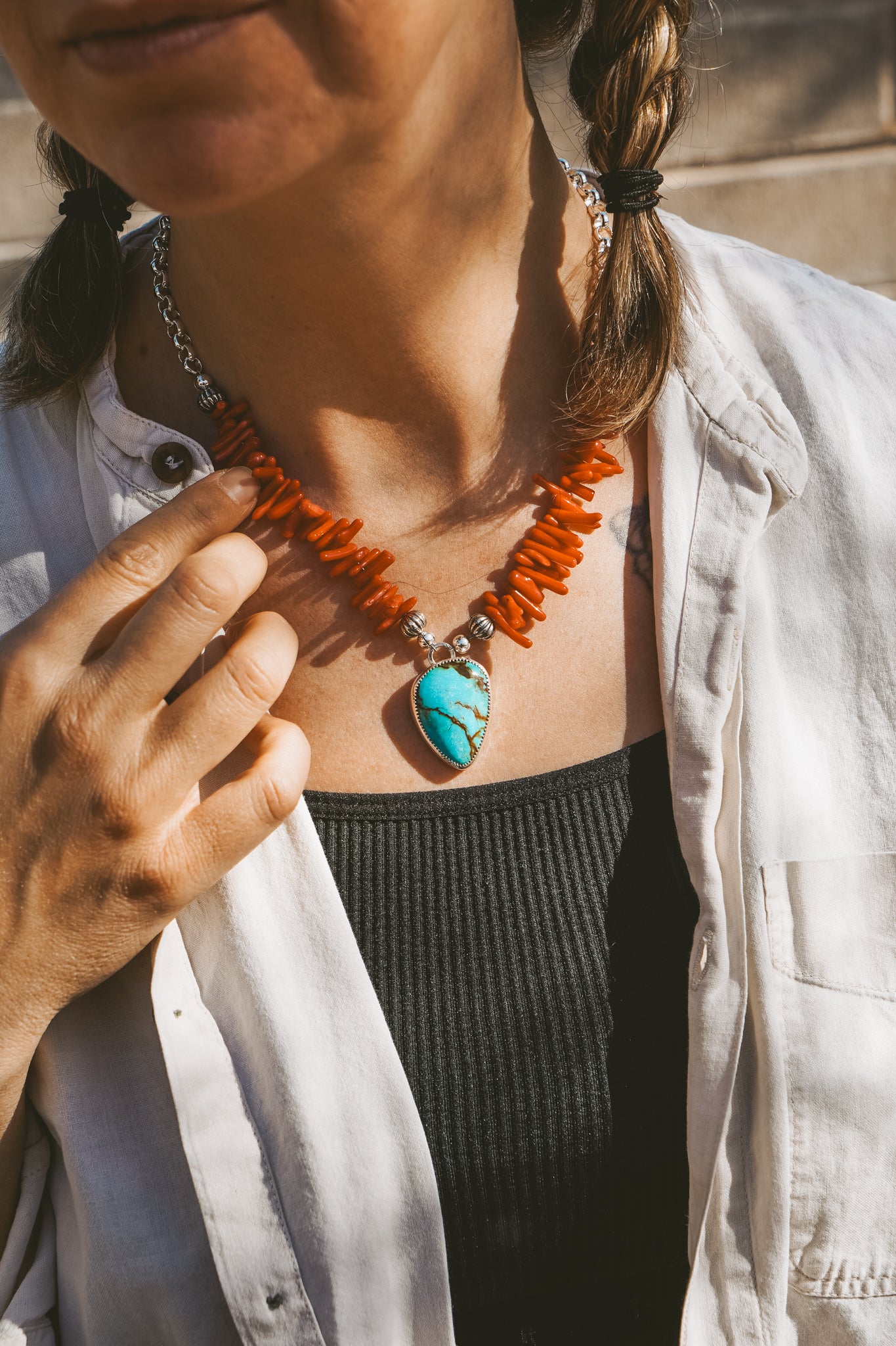 This beauty is a special one! We're absolutely obsessed with the shapes, colors, and pattern created by these stunning pieces of turquoise and red coral beads. We can't wait to see who ends up with this one!