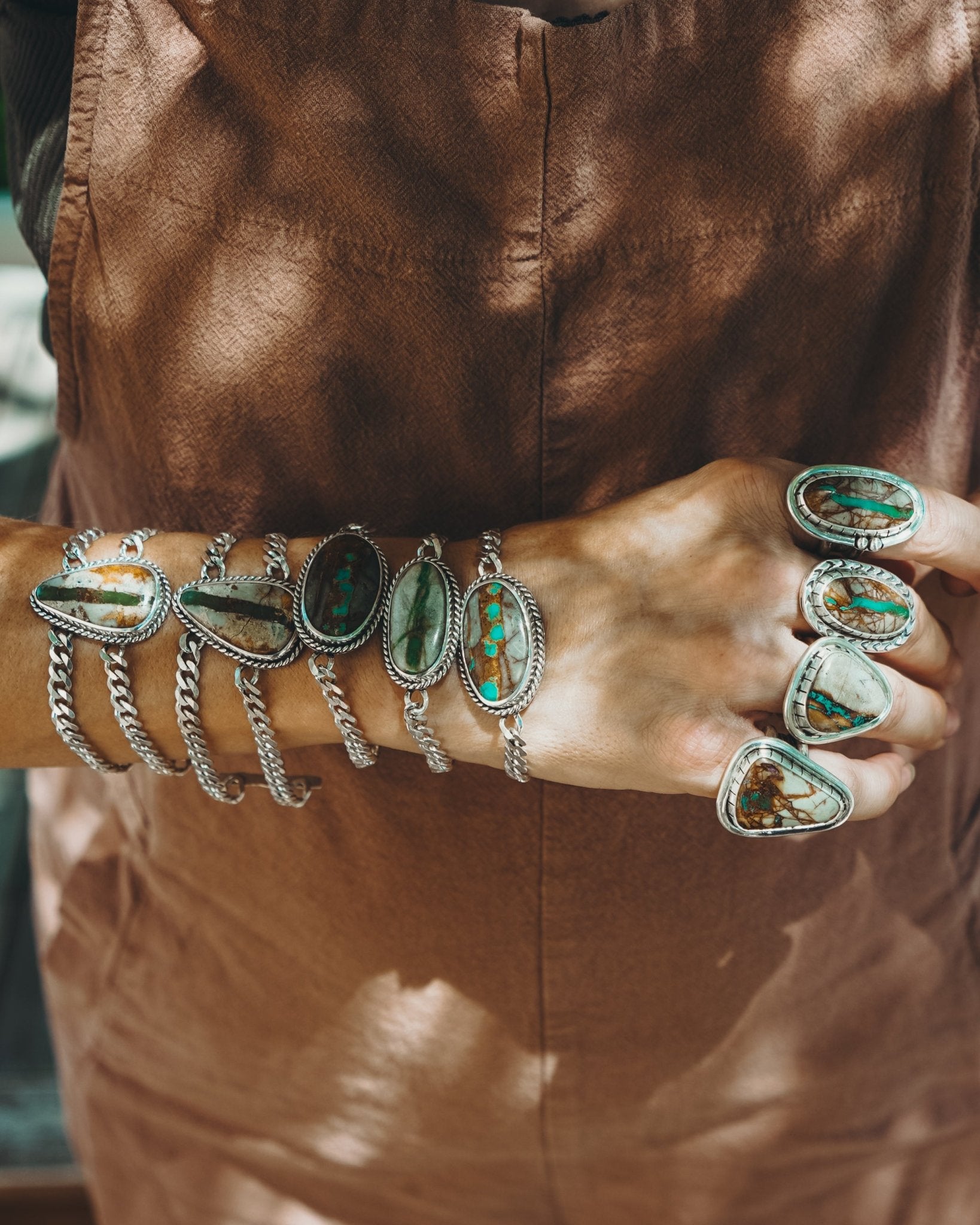 We've been loving Royston Ribbon this month and this large stone is such a beauty- we love the patterns of the matrix. A lot of time went into these 20gauge bezels and  thick, patterned ring bands. We're excited to see who ends up with this one!