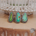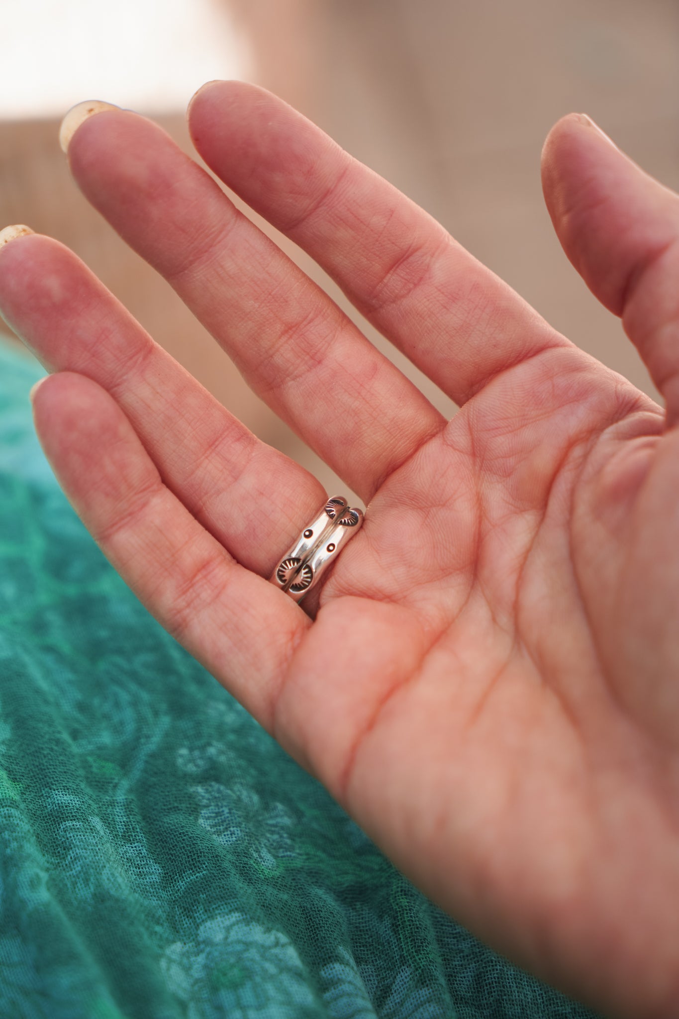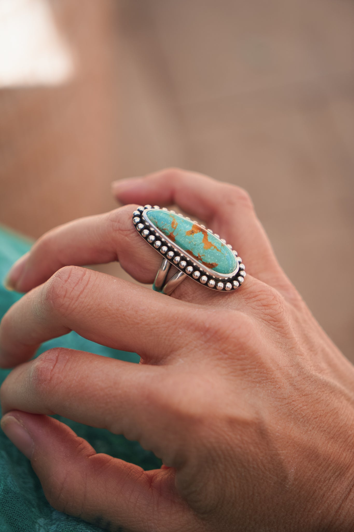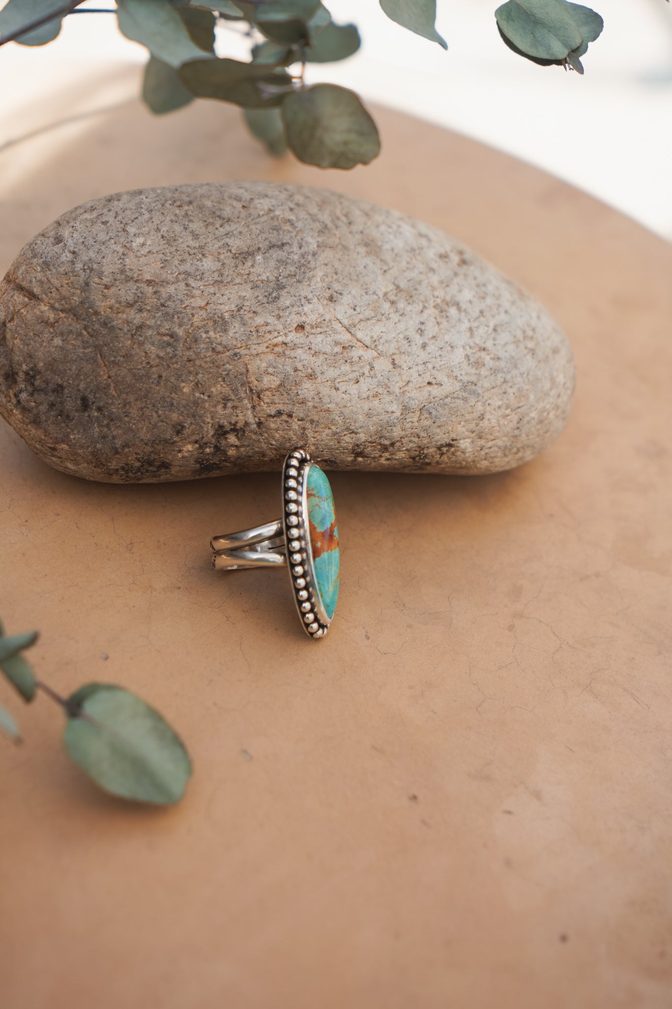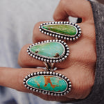 These incredible turquoise stones, bordered by a polished bead wire- it doesn't get much better. We're loving the shape and flow of these beauties. The extra hand-stamped detail on the split band is the chef's kiss.