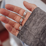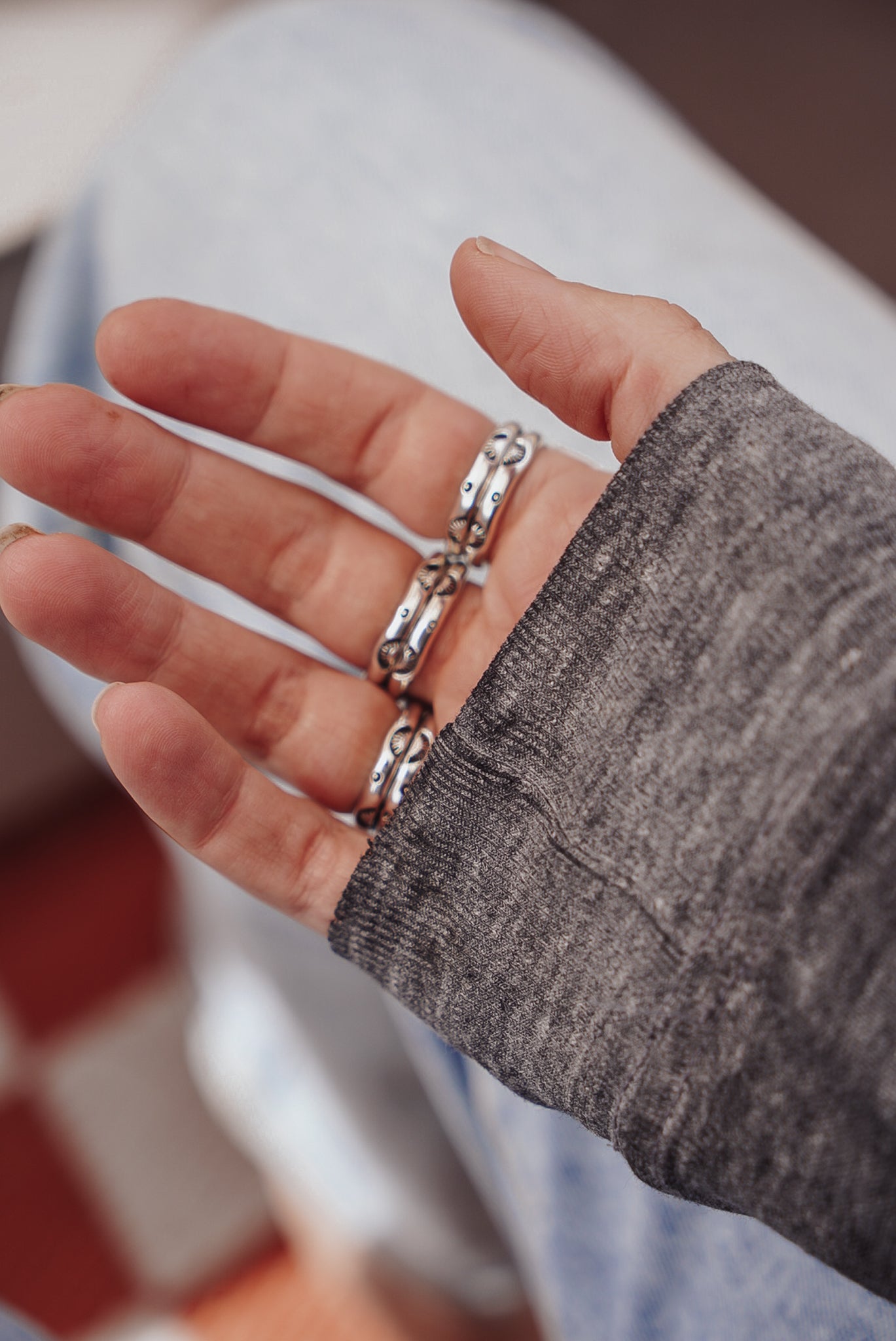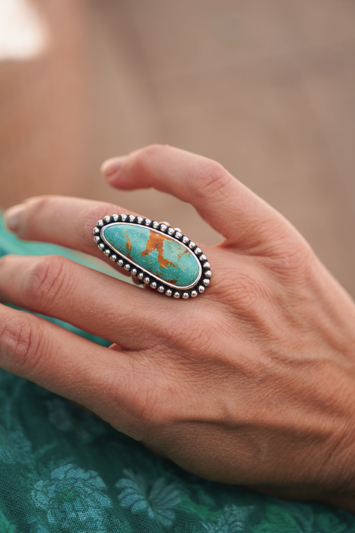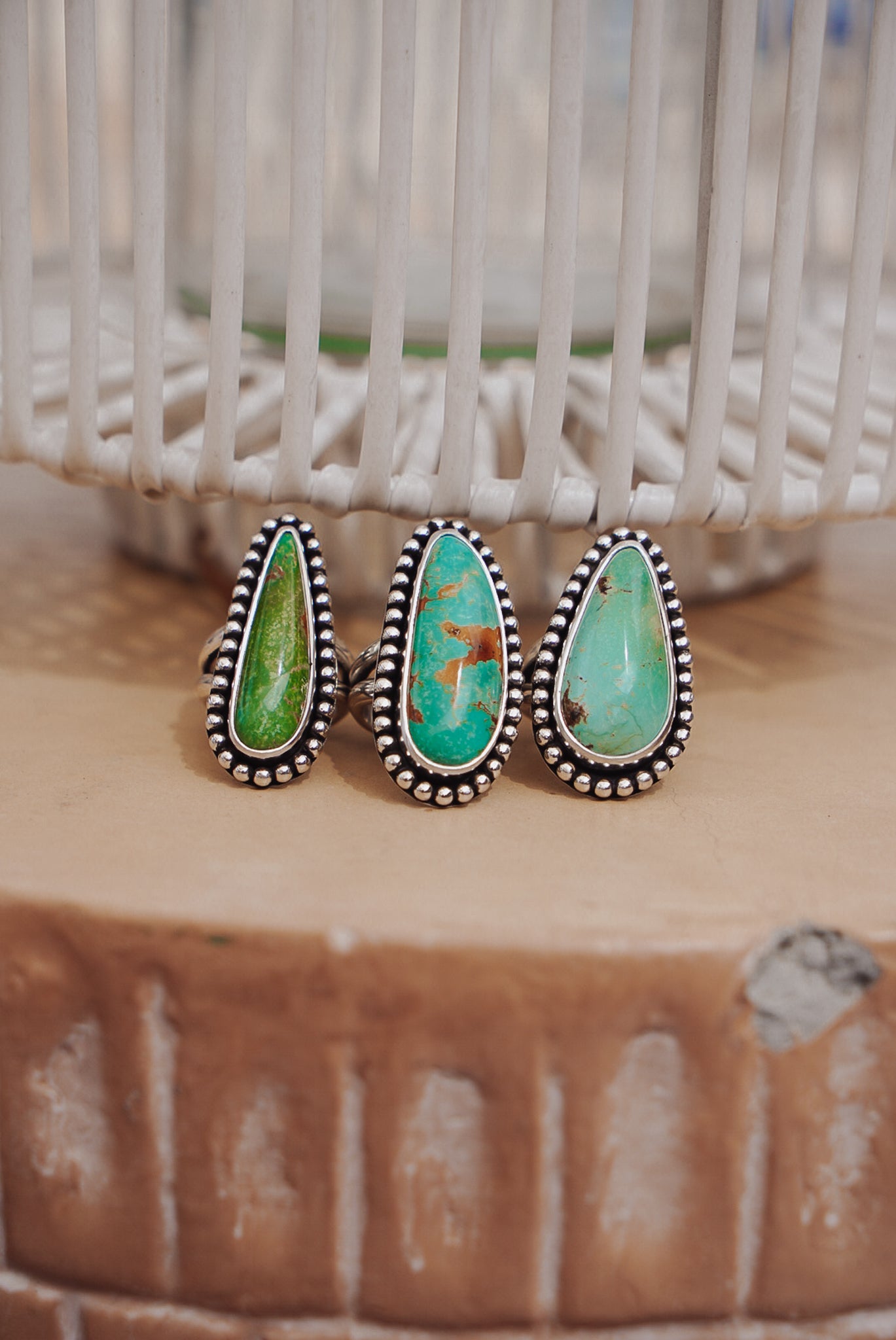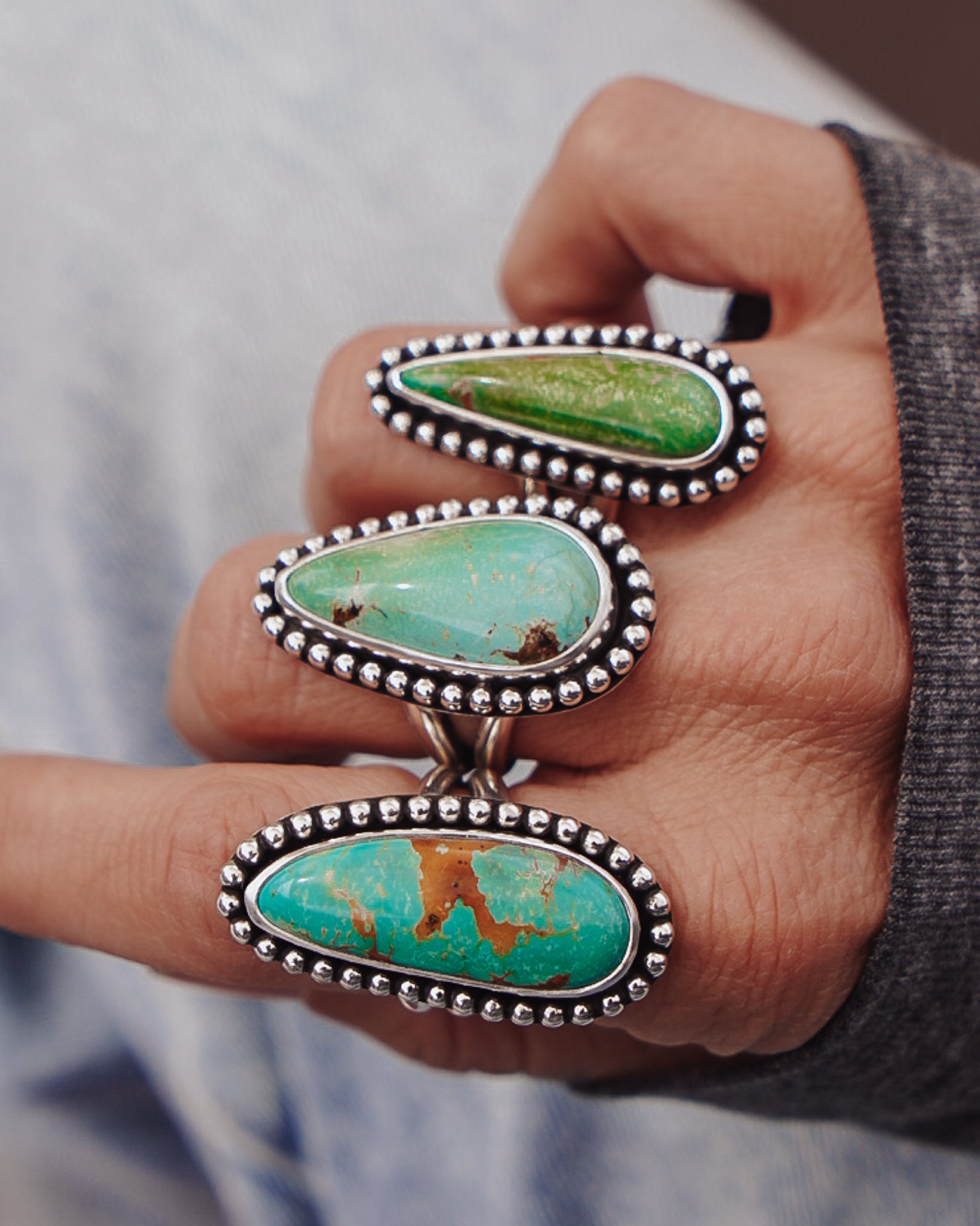 These incredible turquoise stones, bordered by a polished bead wire- it doesn't get much better. We're loving the shape and flow of these beauties. The extra hand-stamped detail on the split band is the chef's kiss.
