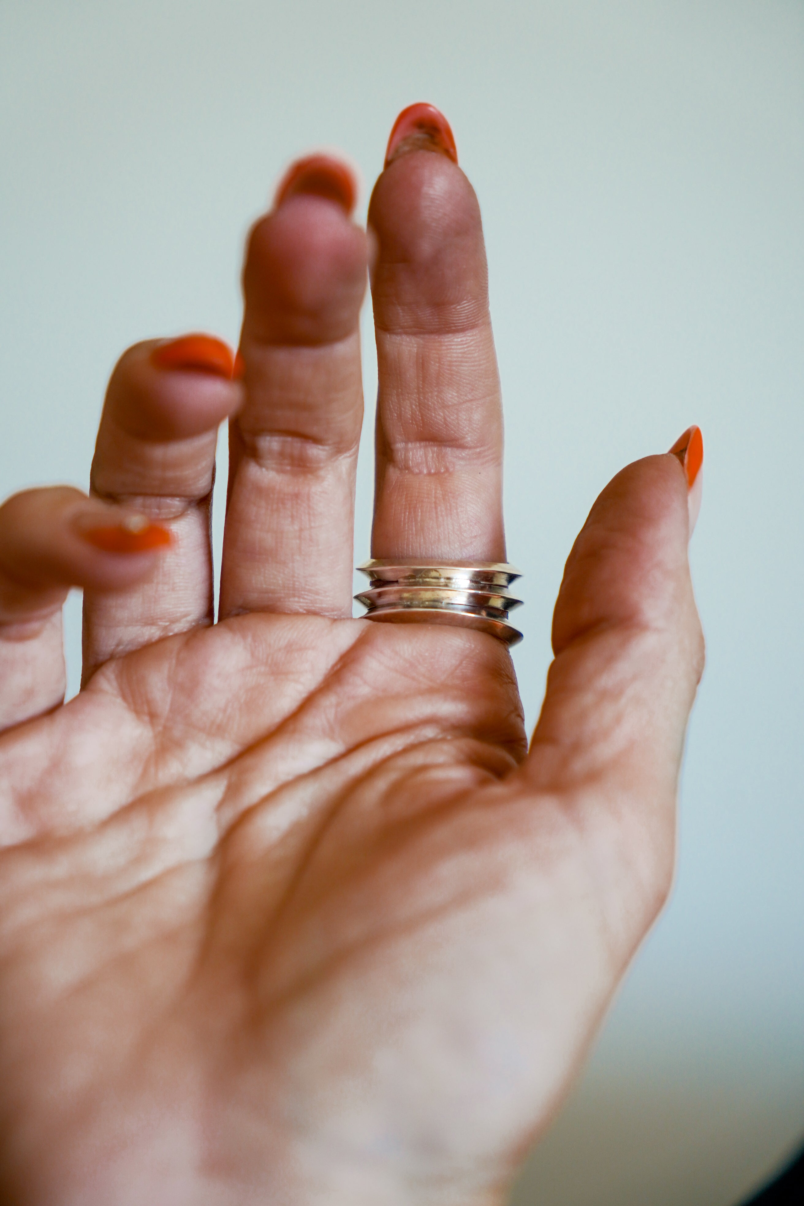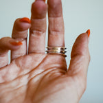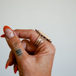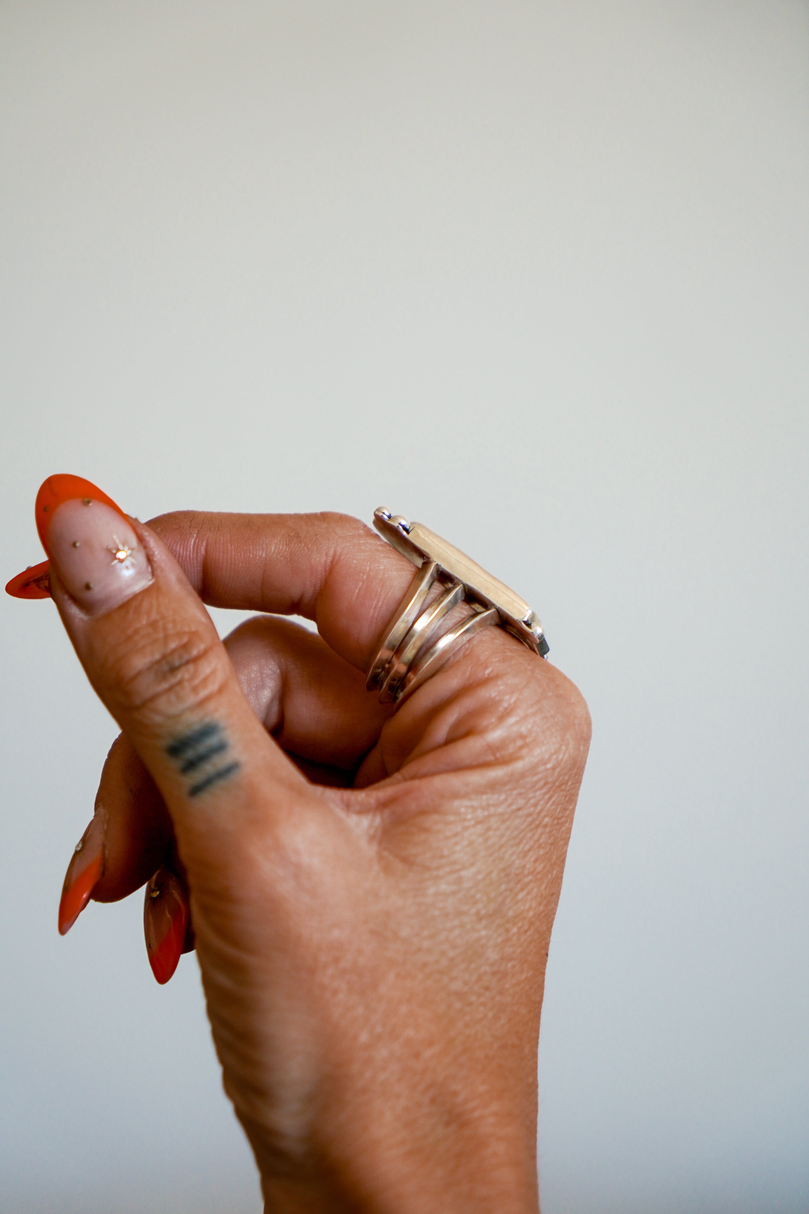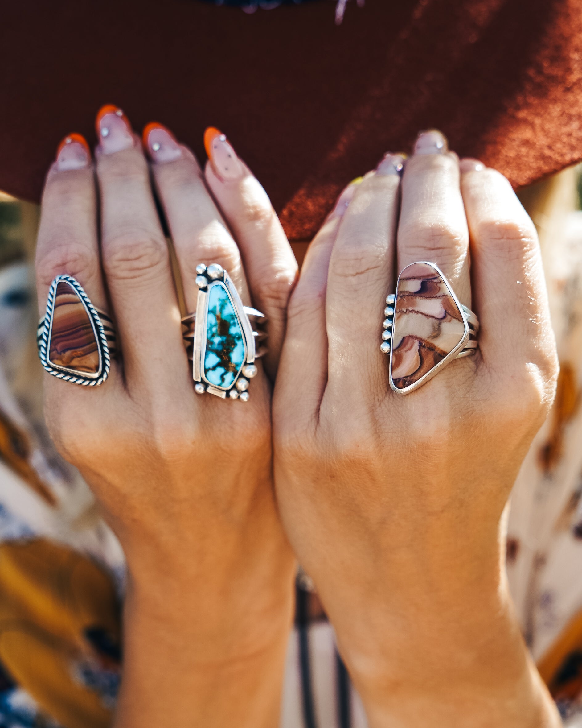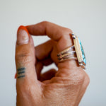This piece of Kingman Turquoise is so unique and we wanted to save it for a special design. We love the contrast of the dark brownish matrix with the light blue of the stone. We're really proud of how this turned out. The asymmetrical balls and square wire around the bezel make for a one-of-a-kind, funky piece. And the thick triple-band with triangle wire is one of our favorites!