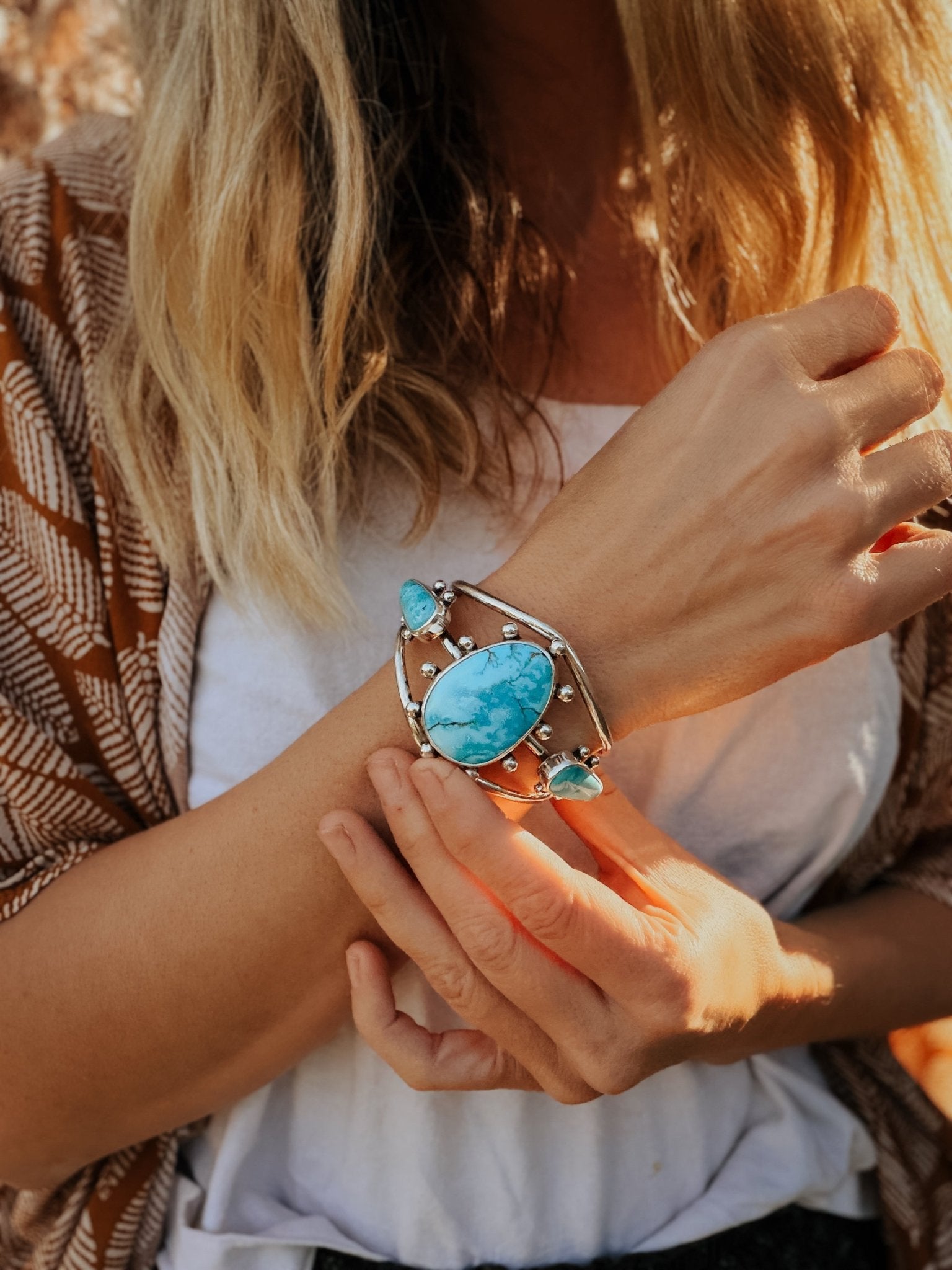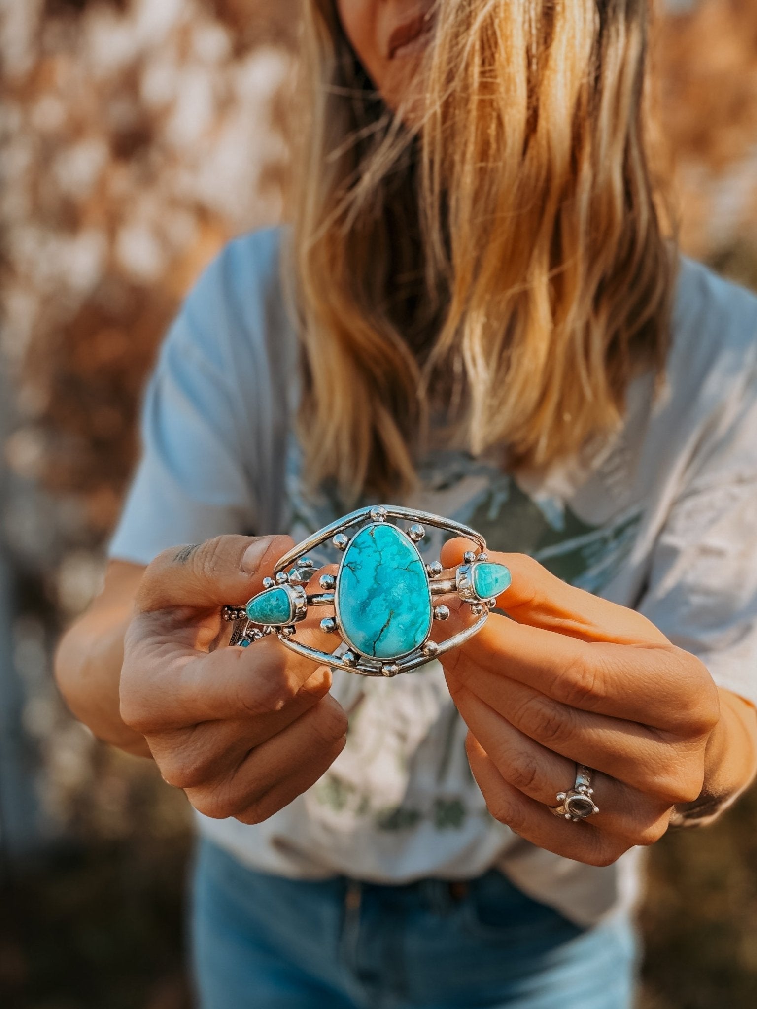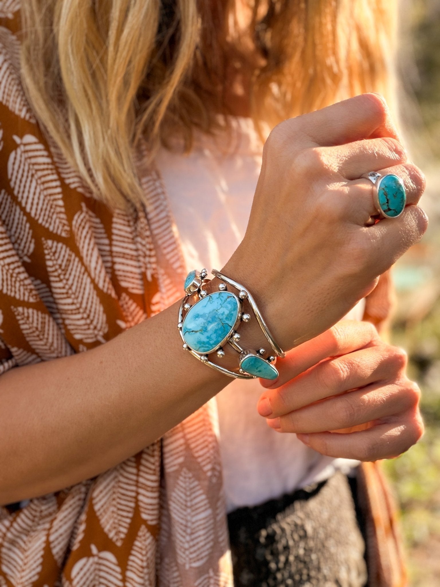 We love the flow-y shape and contours created by these stones and this triple cuff band. This color and matrix of this light blue turquoise really pops and makes this such a special piece. We added some fun, die-struck caps to the cuff ends- a piece like this deserves attention to all the small details.