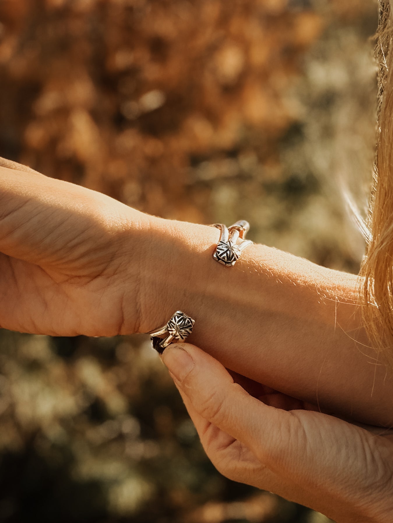 .925 Sterling Silver. 5.75" cuff with 1" opening can be adjusted to fit and then adjusted minimally once you find your fit.