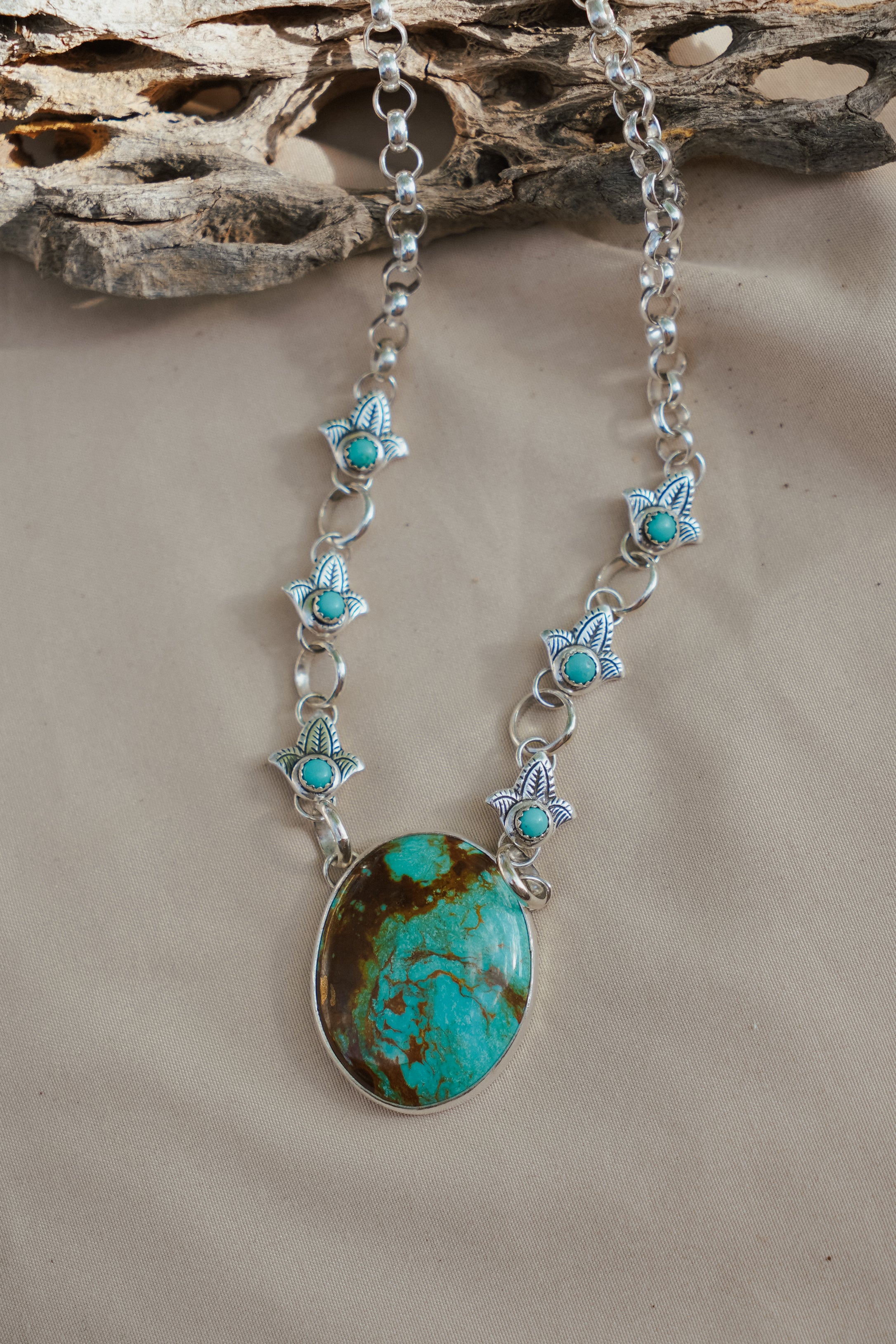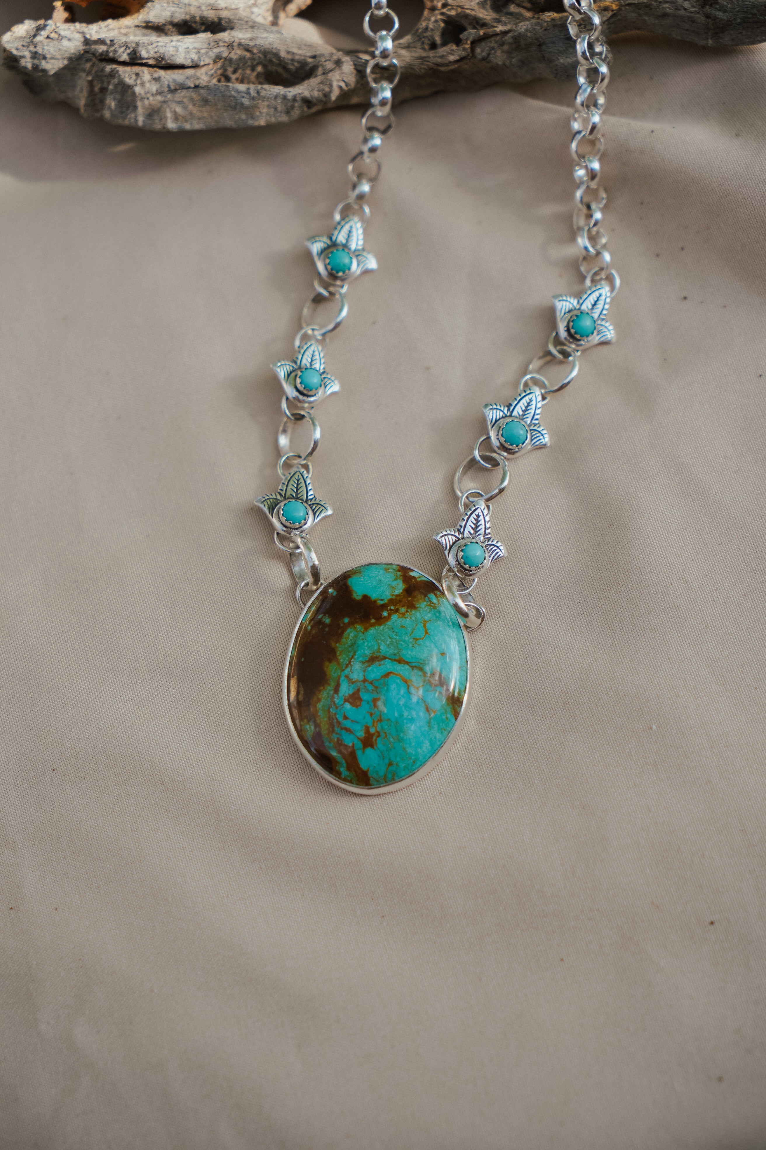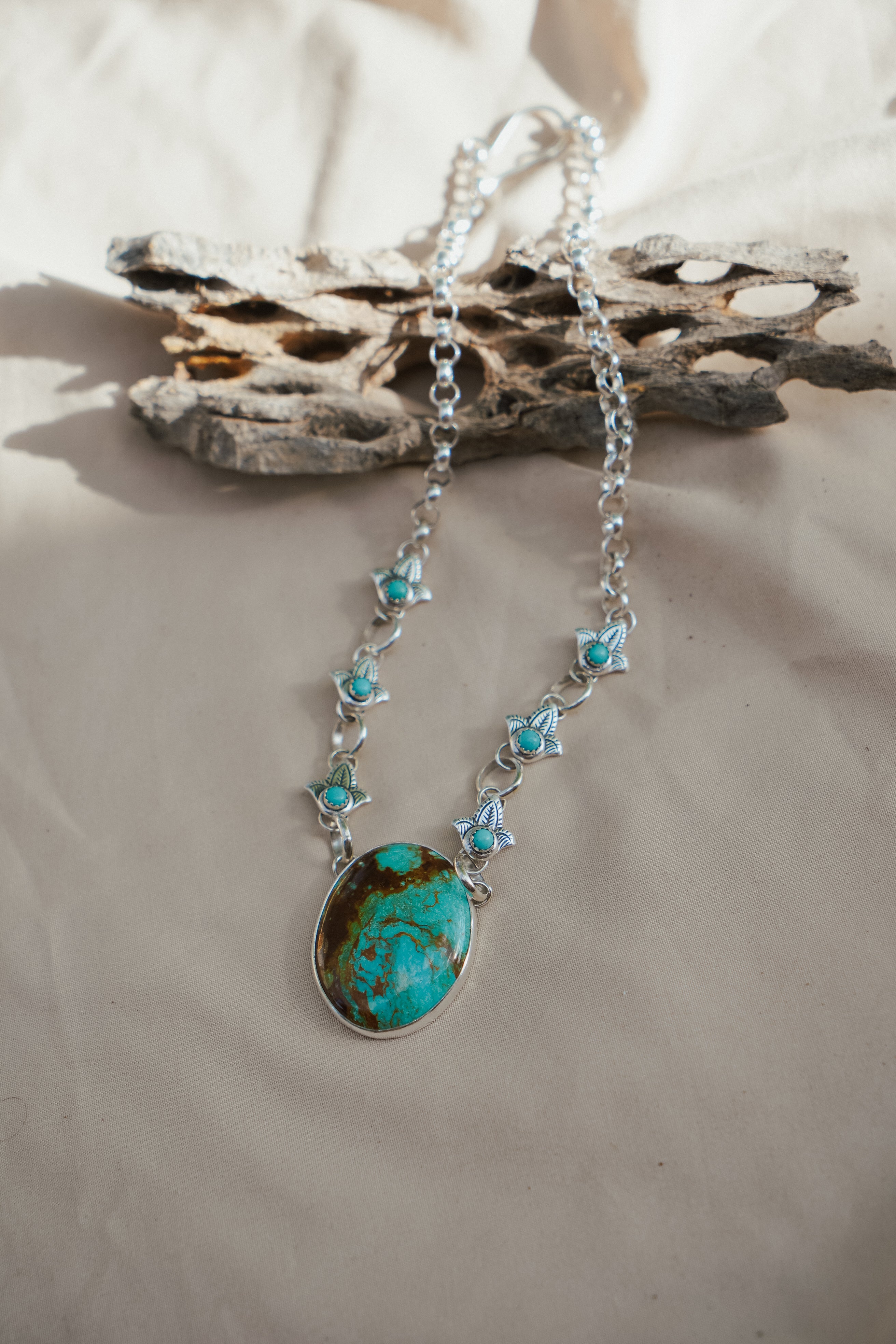 This stunning piece of turquoise does all the talking, but when paired with these handmade sterling silver elements and small turquoise stones it's a truly one-of-a-kind, heirloom piece. This design is a great way to add pop to any outfit and we can't wait to see who it ends up going to.
