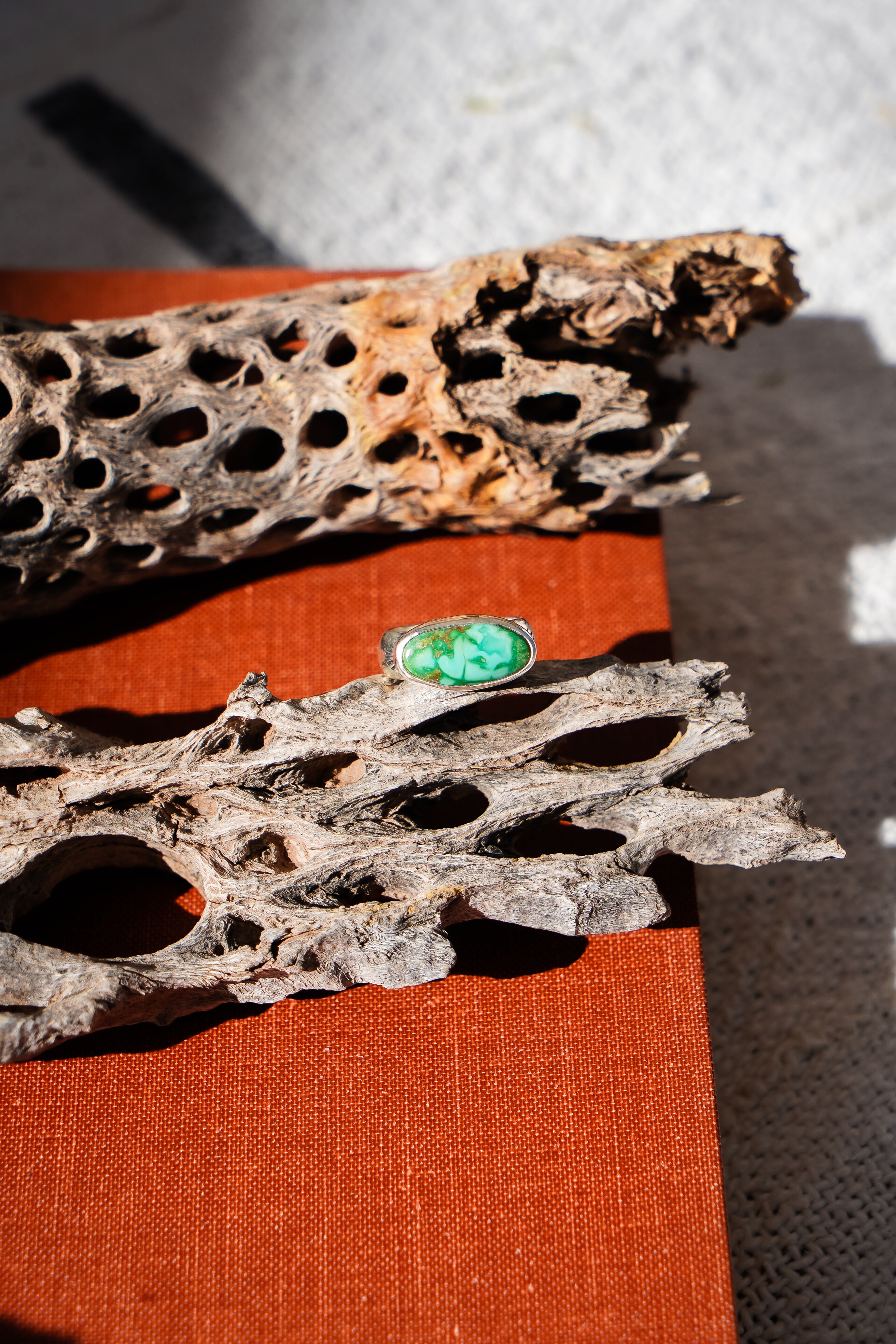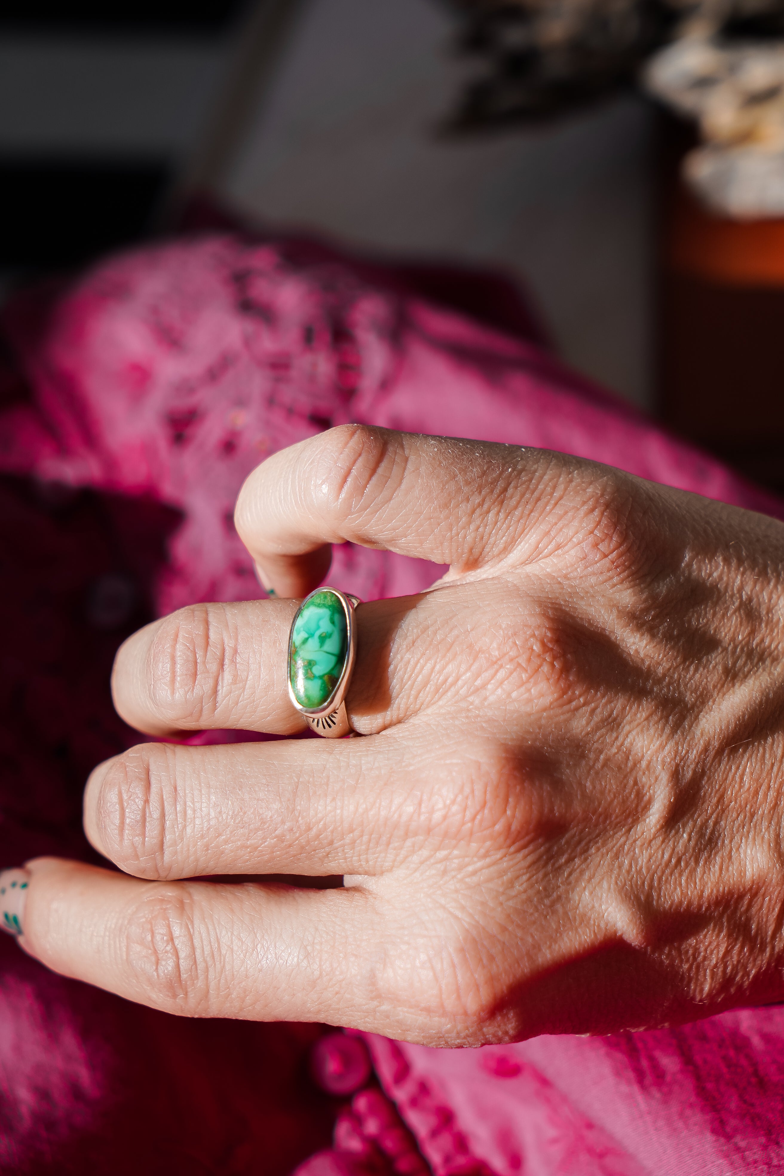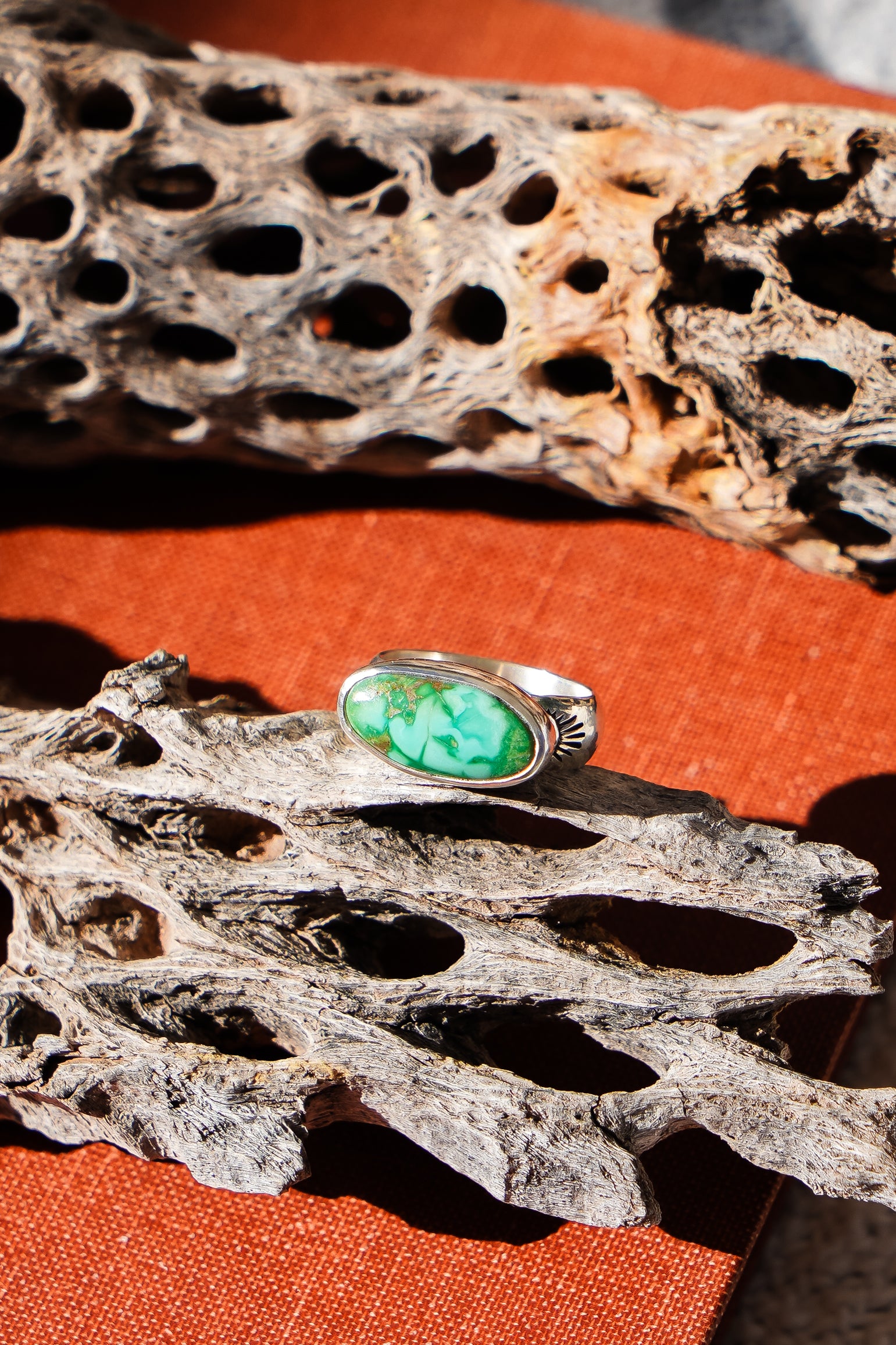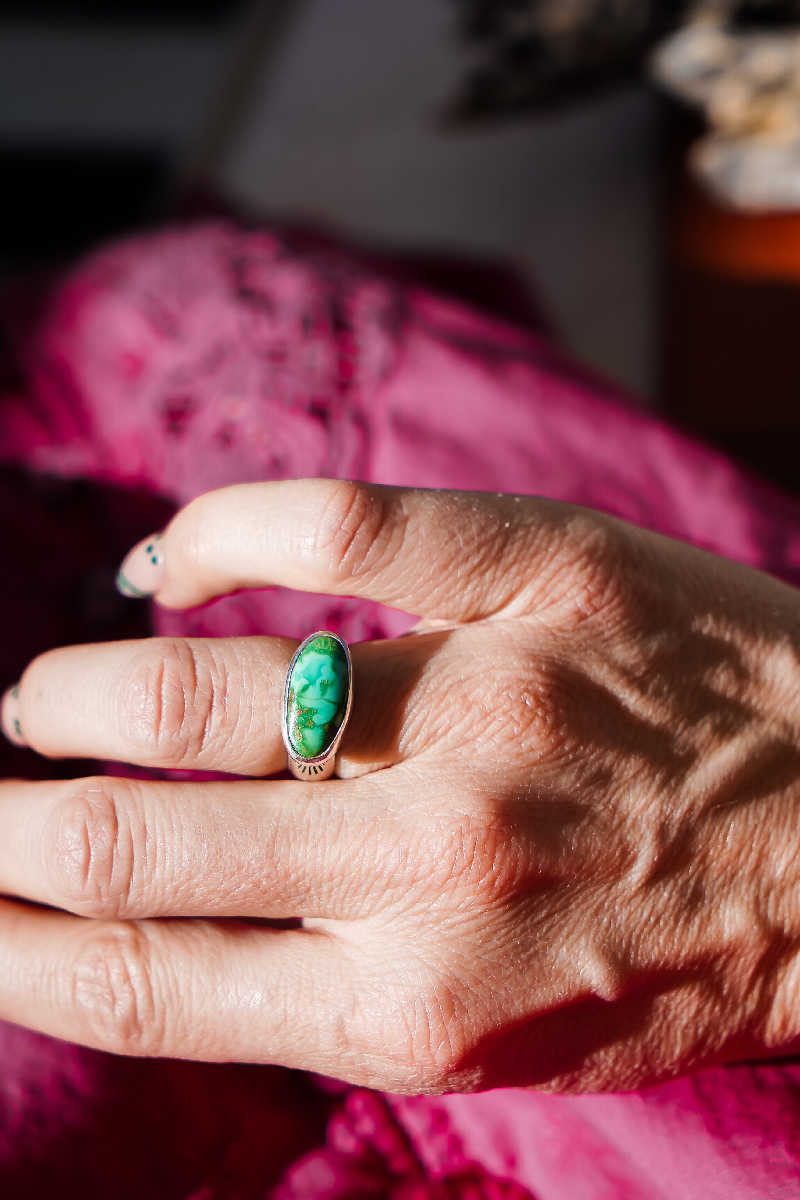 We like to let a stone this vibrant do all the talking! We paired it with a high-polished plain bezel and hand-stamped band. This makes a great ring for everyday wear. It carries a lot of POP!