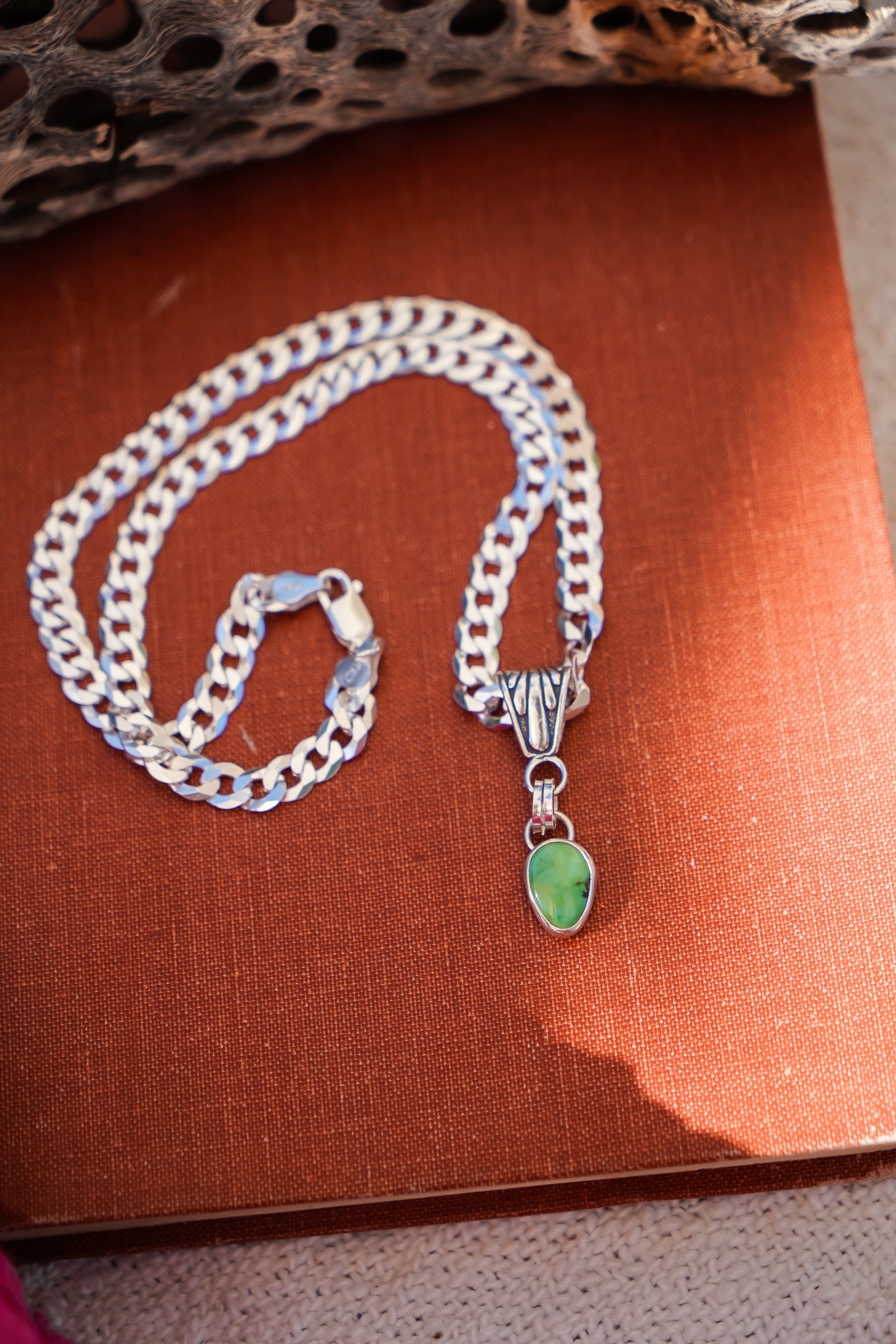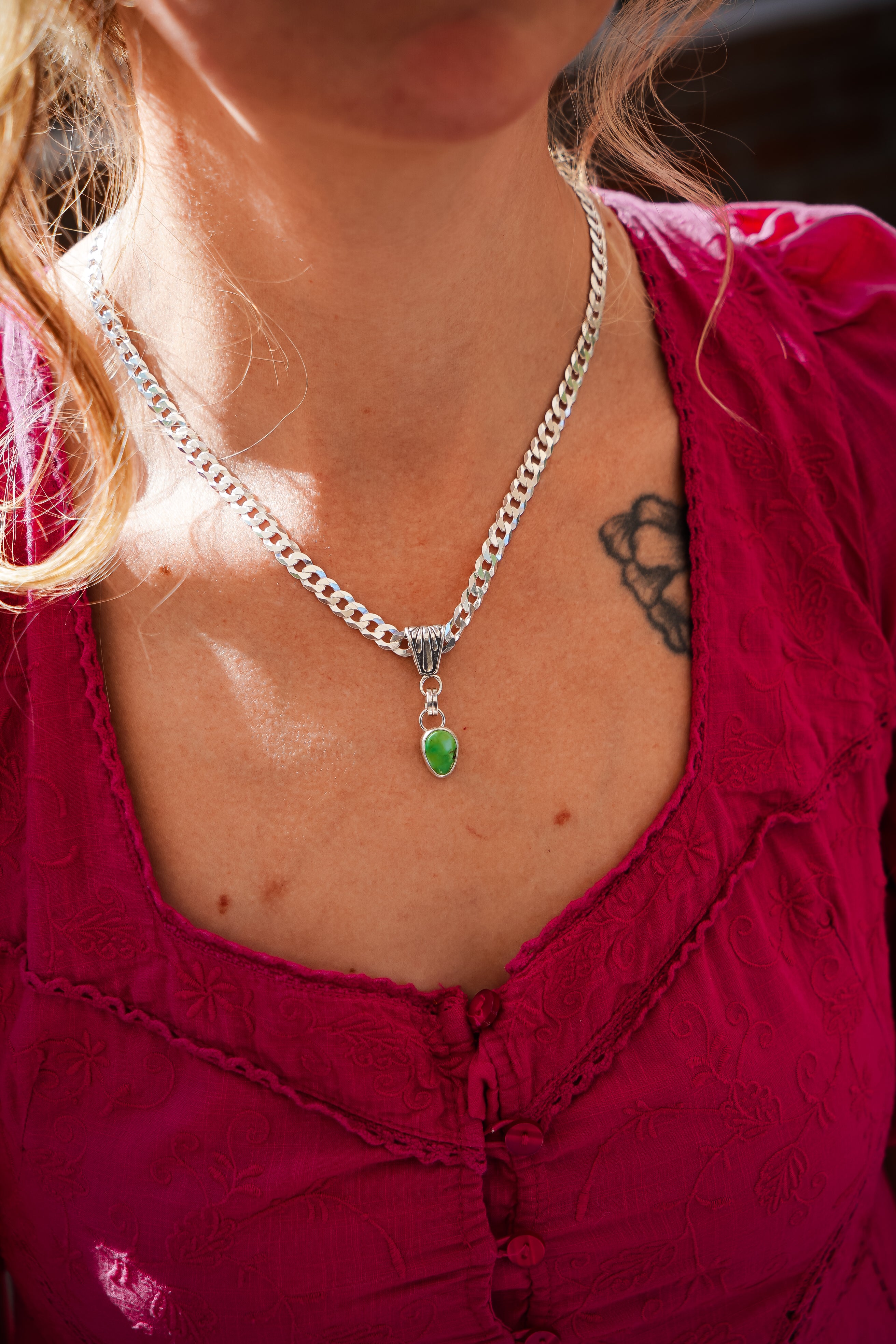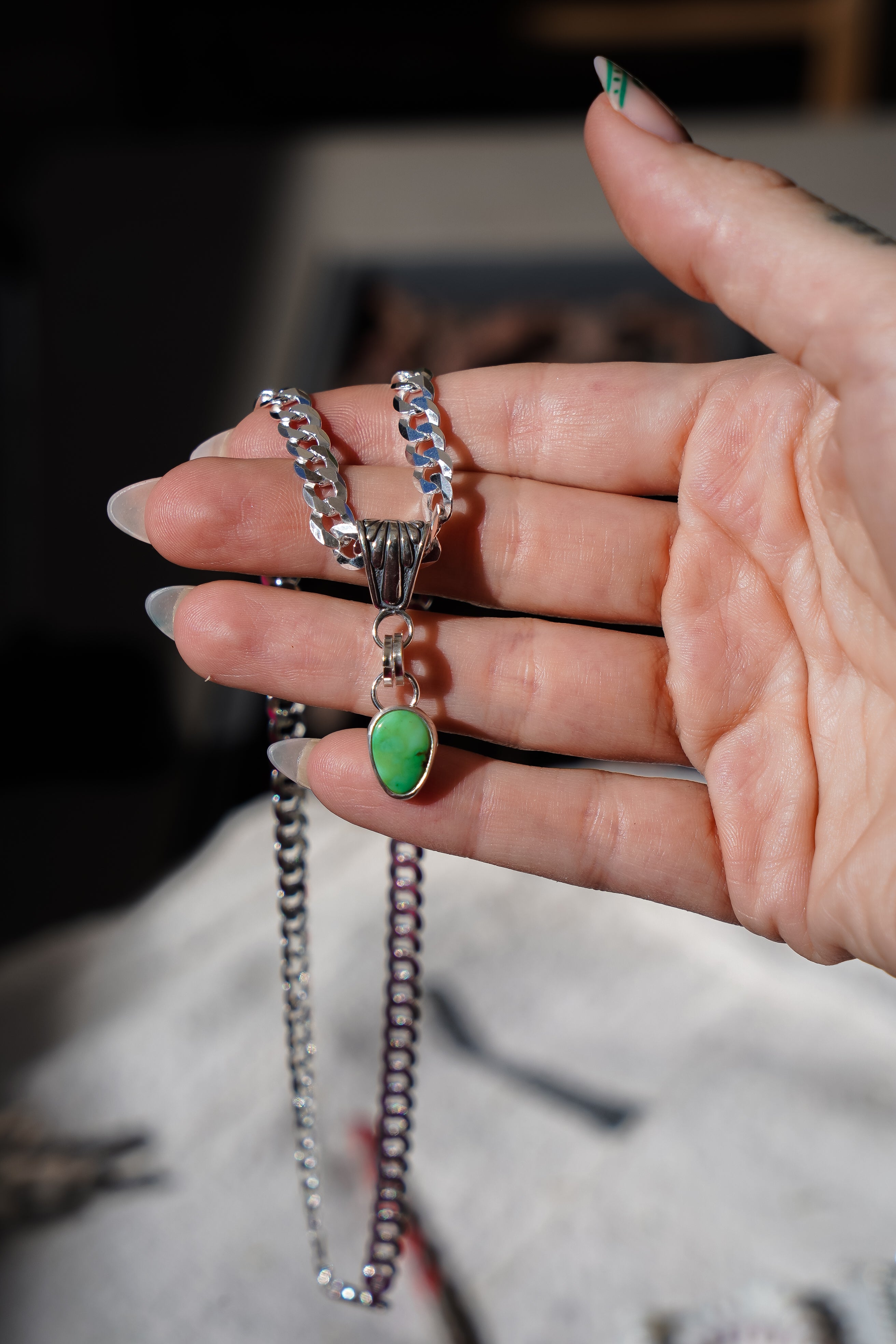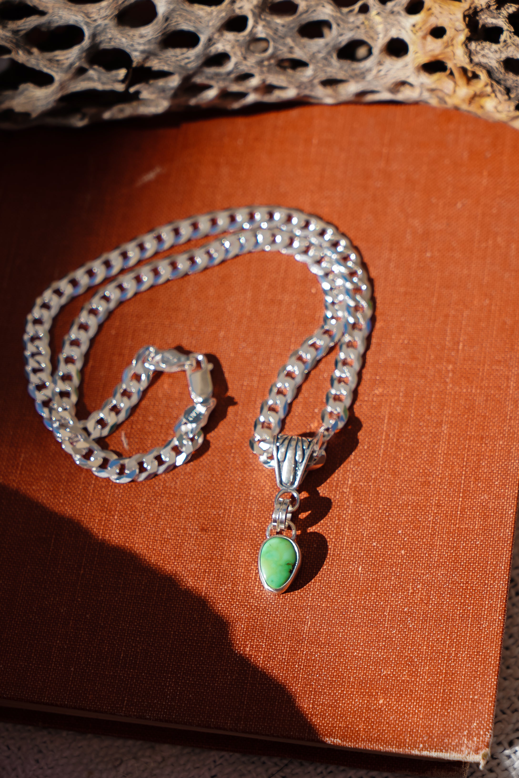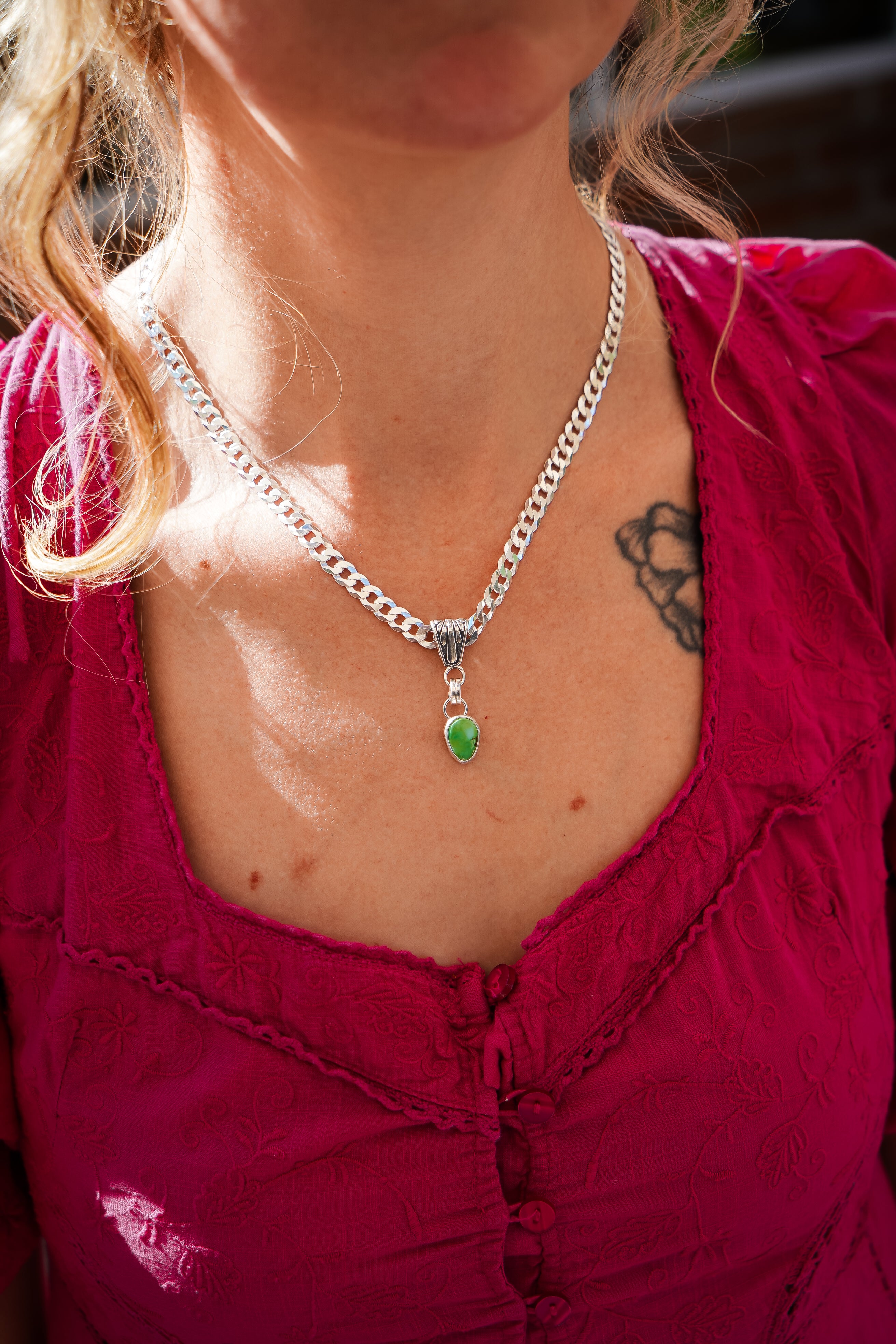Introducing the Viva Verde Necklaces! This lovely Verde Valley stone is the perfect pair for this heavy, flat curb silver chain and decorative bail. Personally, we're obsessed with thick curb chain- it just has all the cool girl vibes. Can't wait to see who snags this one.