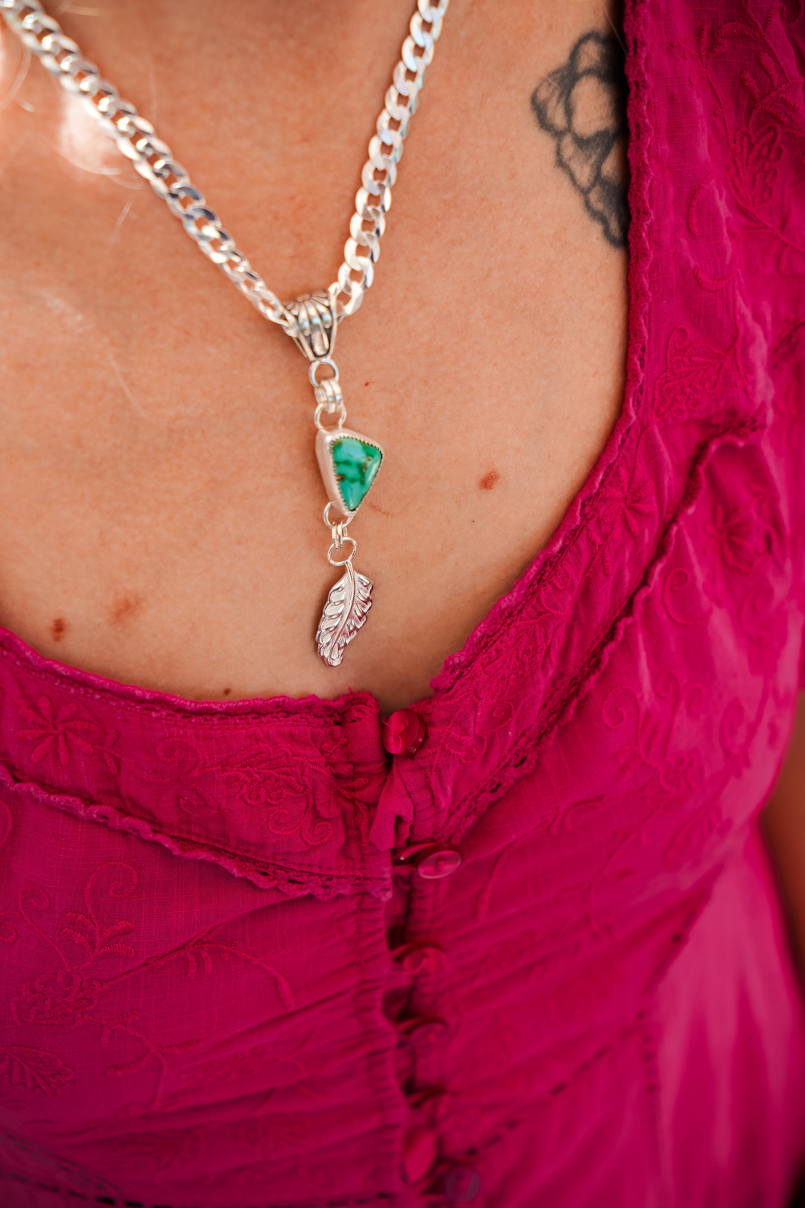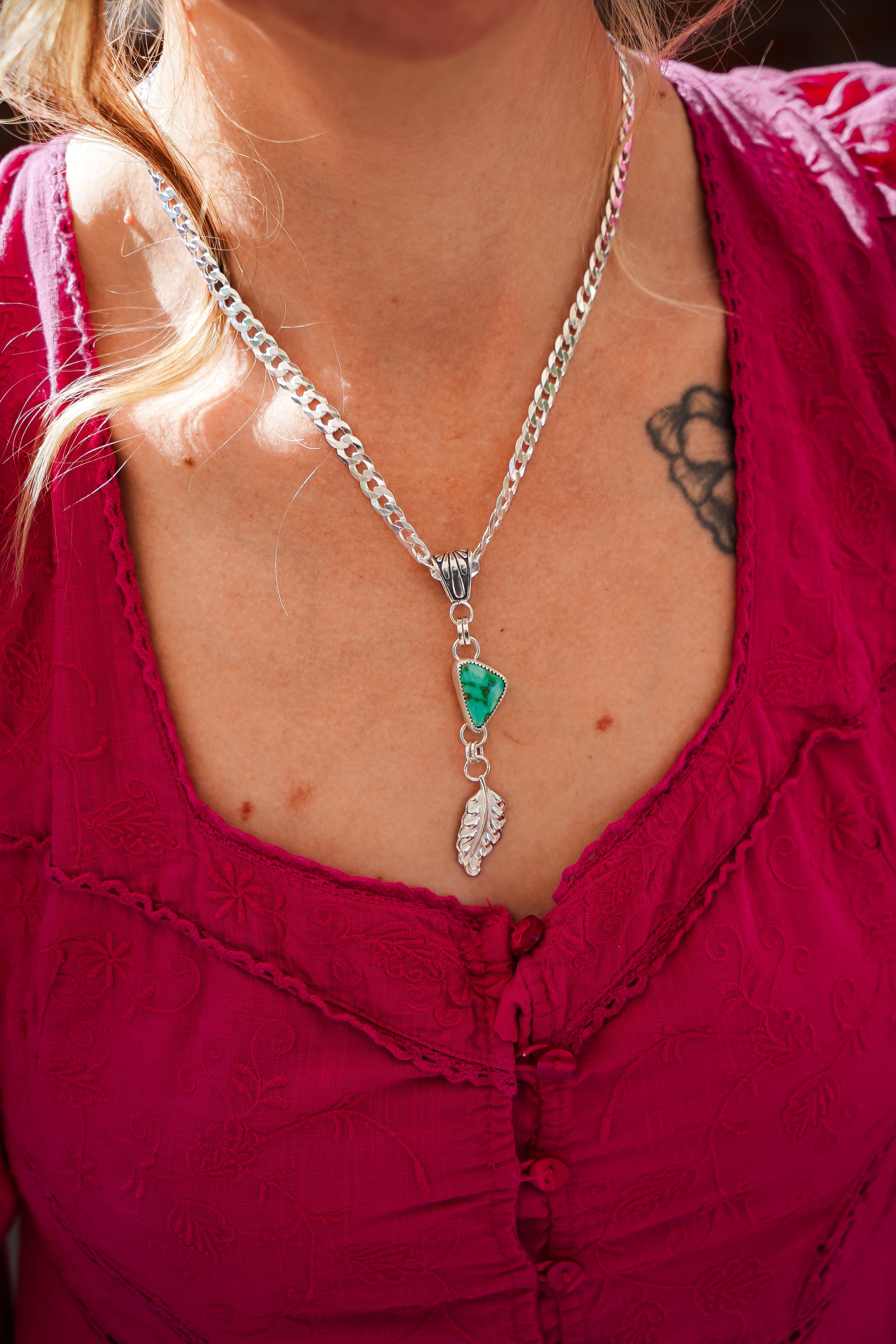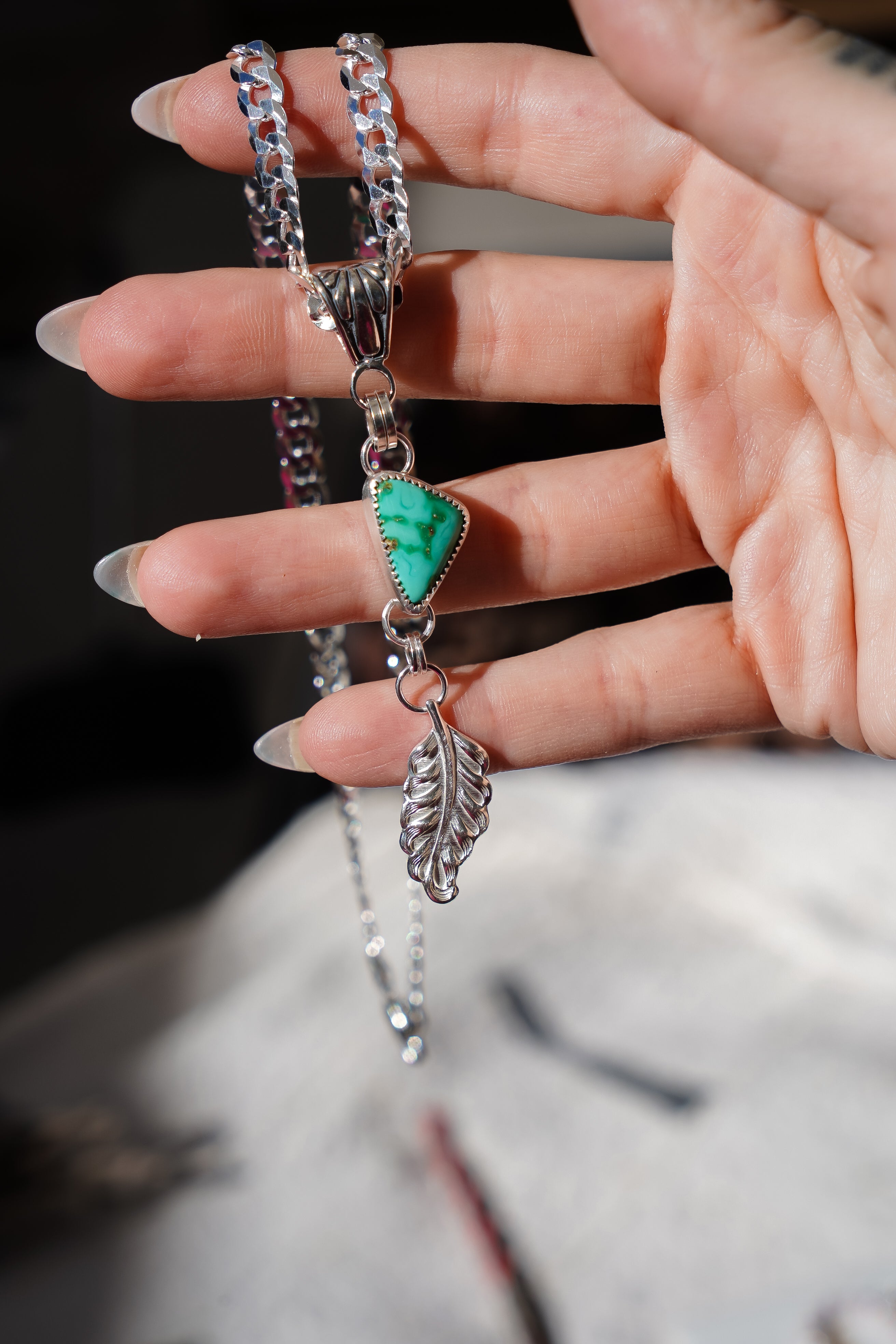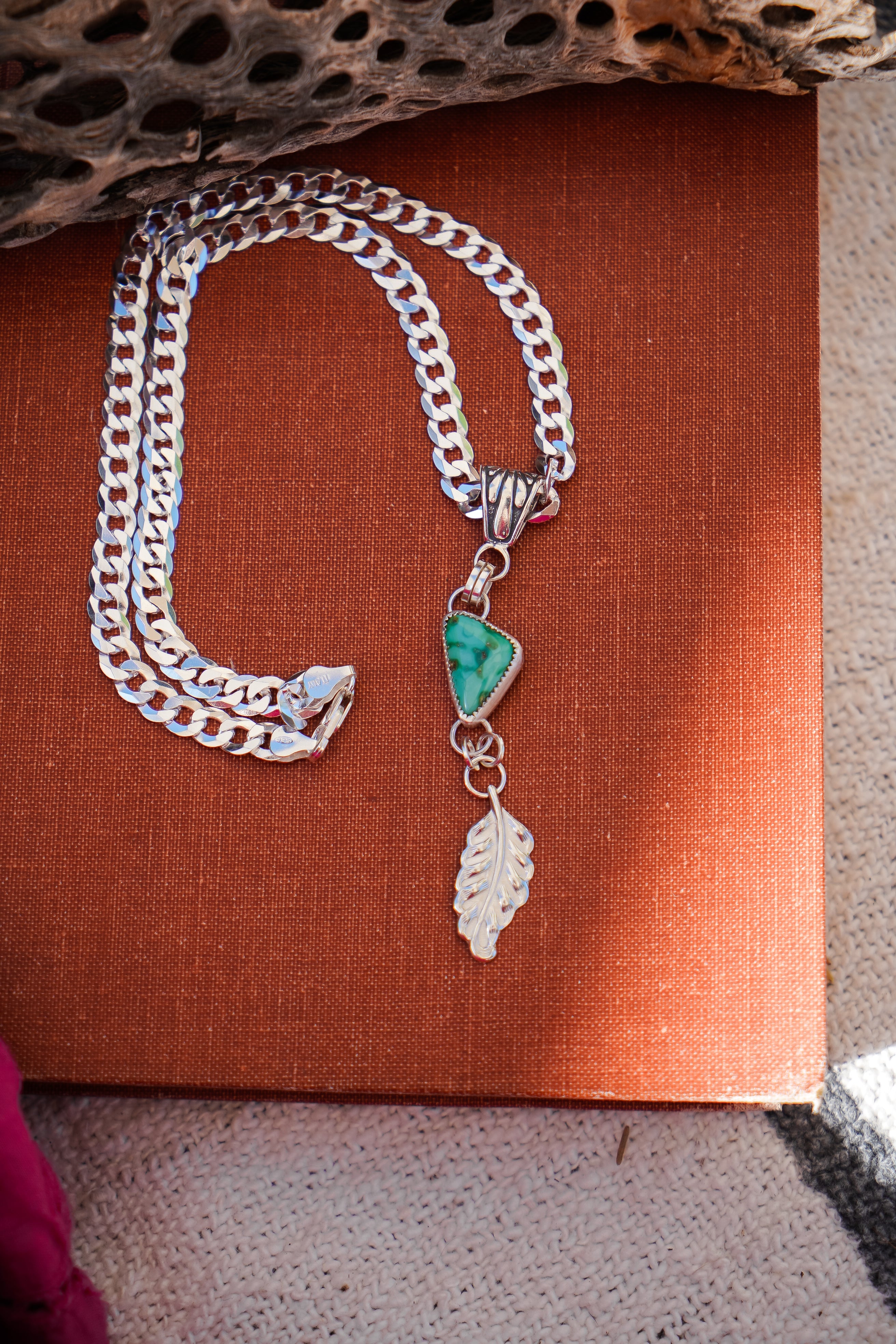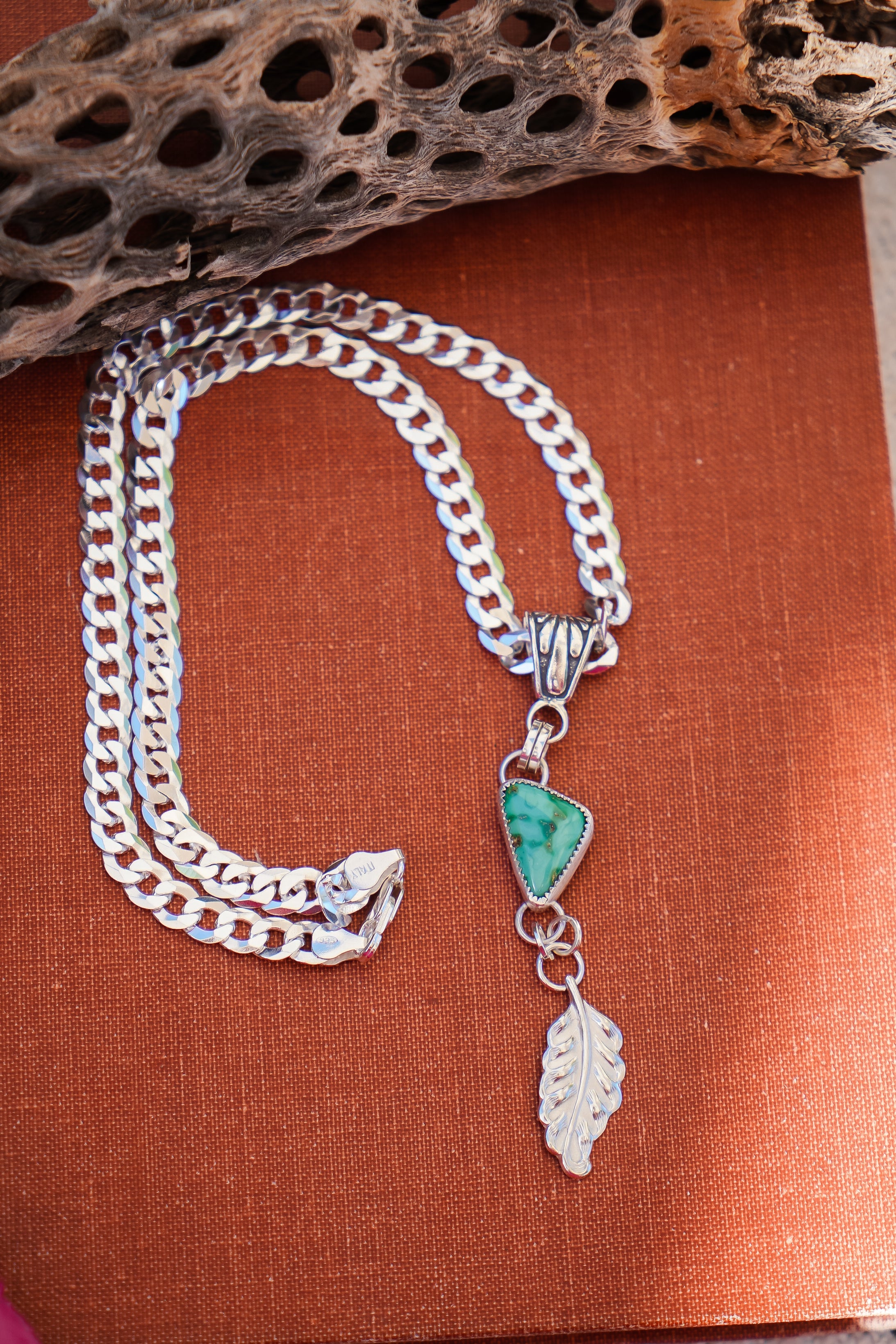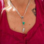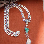 Introducing the Viva Verde Necklaces! This lovely Emerald Valley stone is the perfect pair for this heavy, flat curb silver chain and decorative bail. We had fun adding this die-struck leaf dangle charm. Personally, we're obsessed with thick curb chain- it just has all the cool girl vibes. Can't wait to see who snags this one.