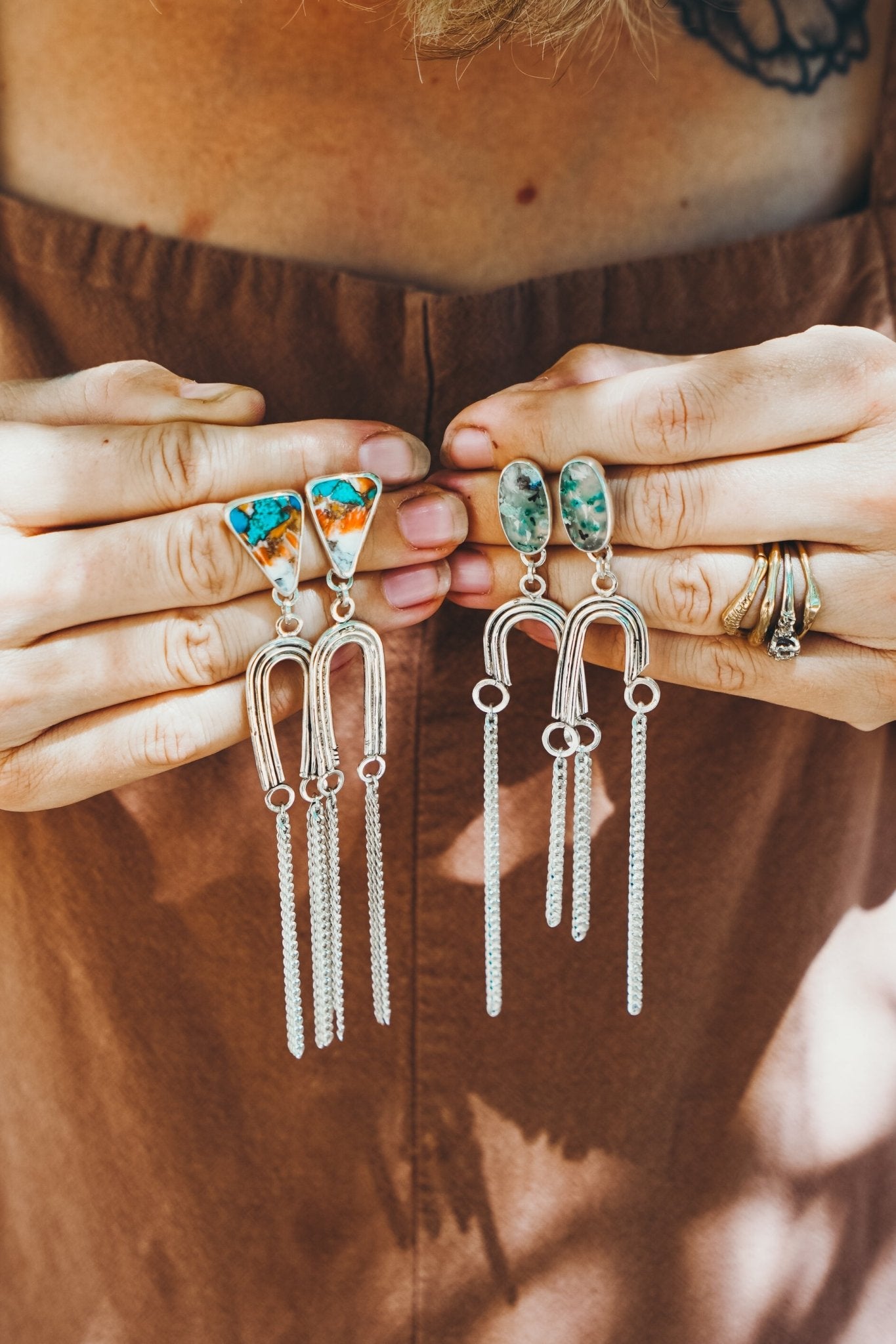 This has been one of our favorite earring designs the past few months and this is the first time we've used this stone in them. IN LOVE! We can't get over these beauties. We love the rainbow shape and the fun dangle fringe. Can't wait to see who ends up with these!