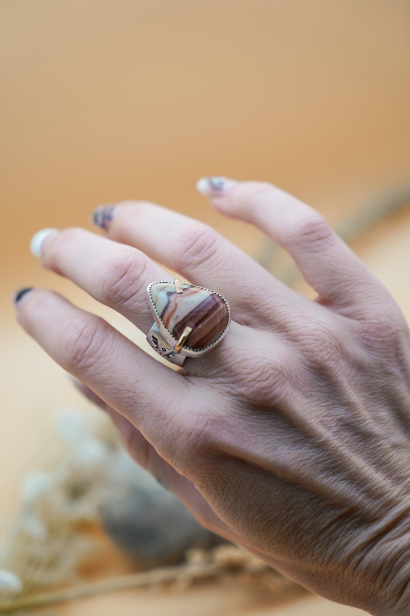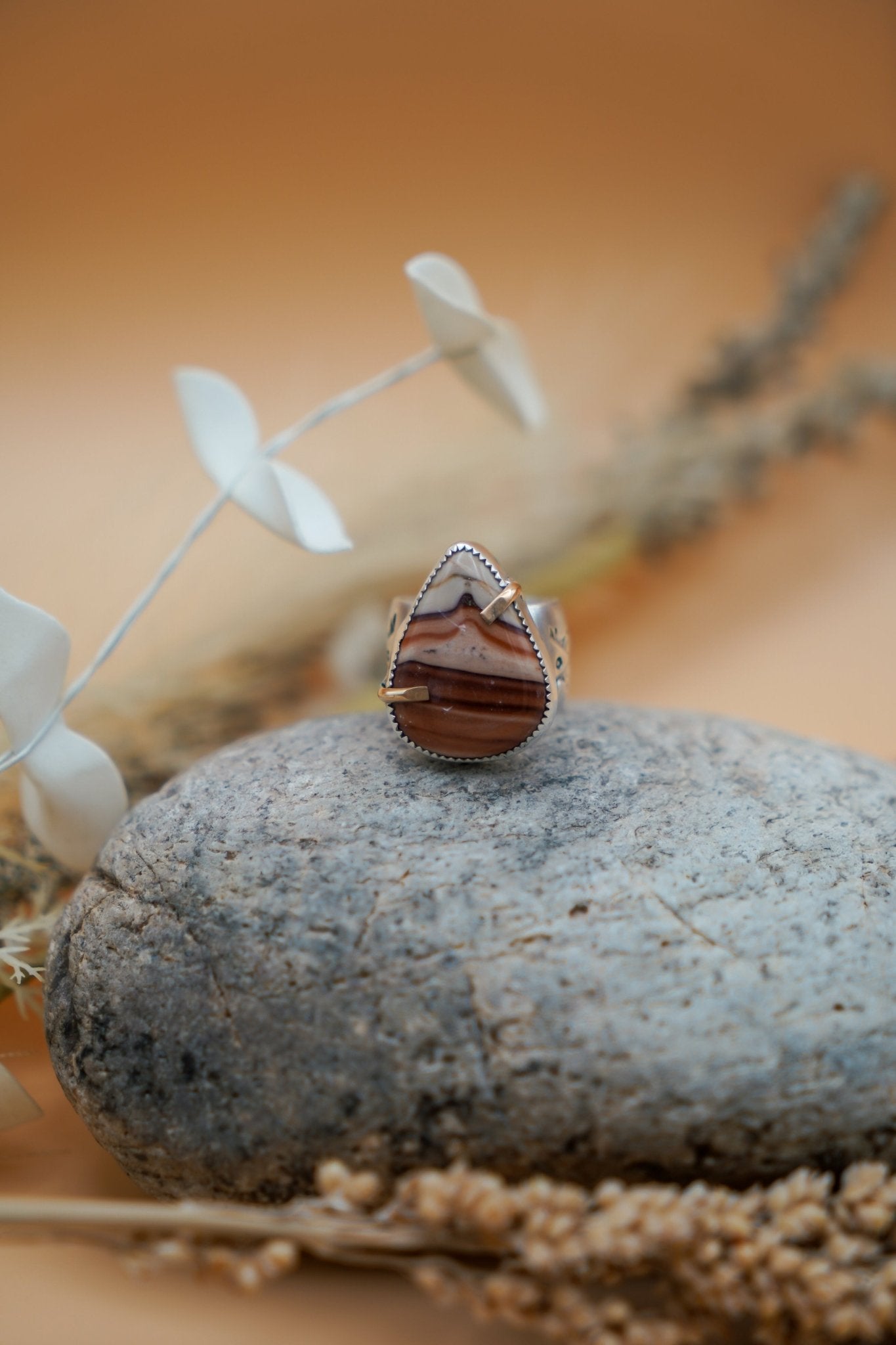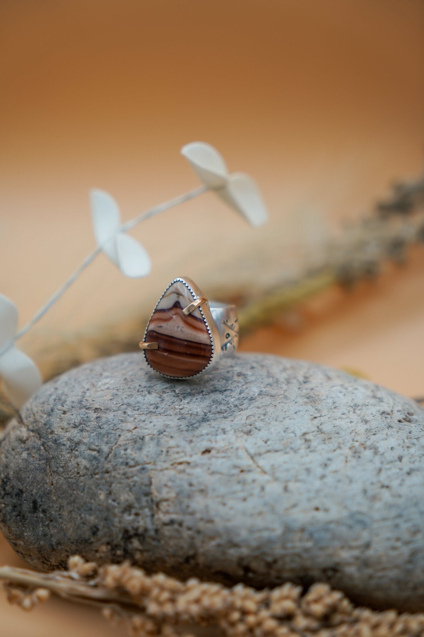 Oh man- it doesn't get better than this scenic agate contrasted with the gold-fill prongs!  The lovely wide band has been hand stamped and formed for the most comfortable fit and goes on smooth like butter.